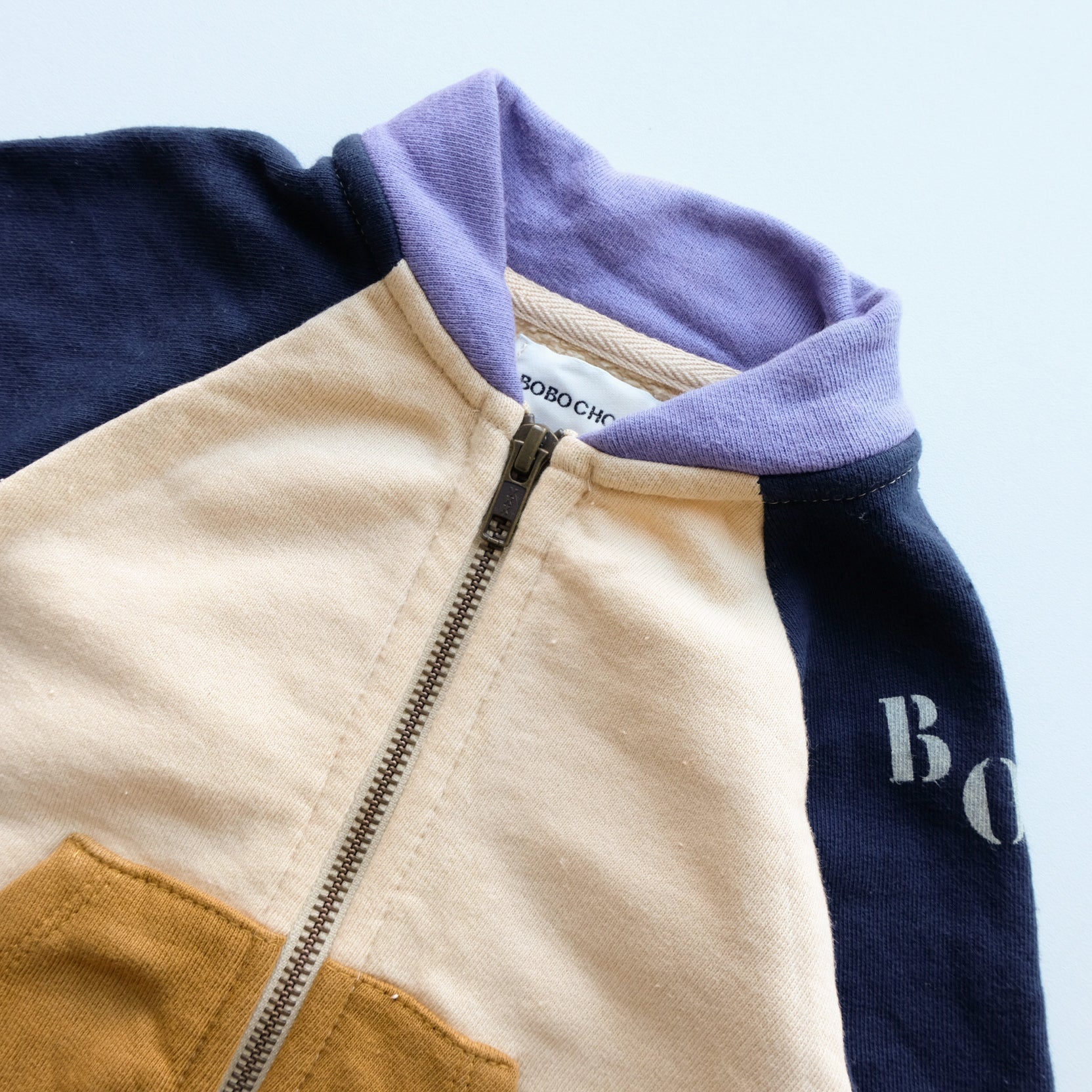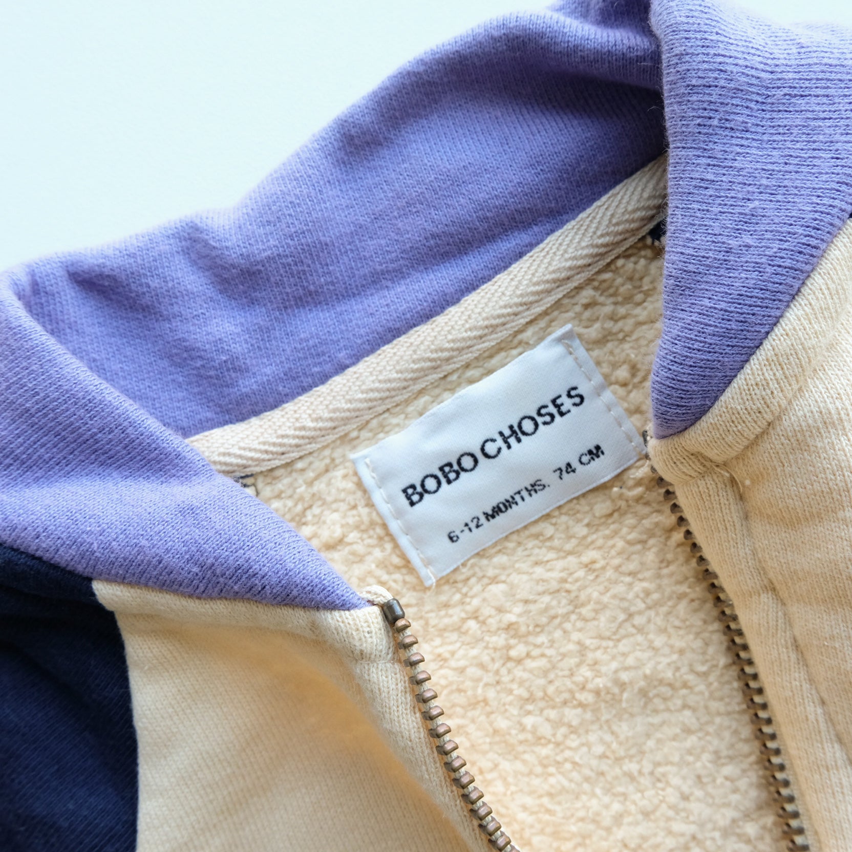 Adorable gilet à manches longues en coton, color block : lilas, vanille et bleu marine. Zip au devant. Col teddy. Trop mignon !