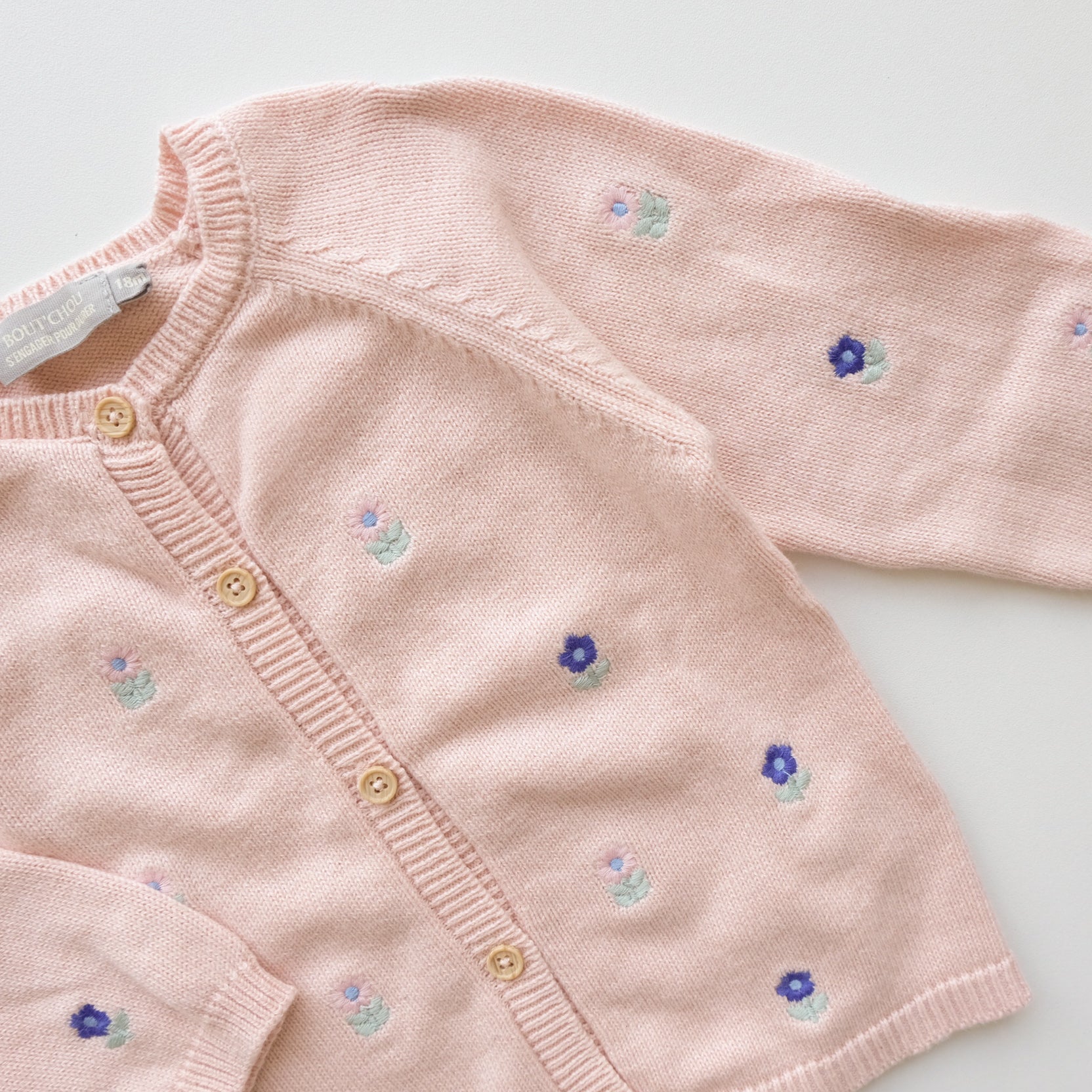 Gilet, cardigan à manches longues, maille en coton, coloris rose, fleurs brodées all over. Boutonnière au devant. Super mignon !