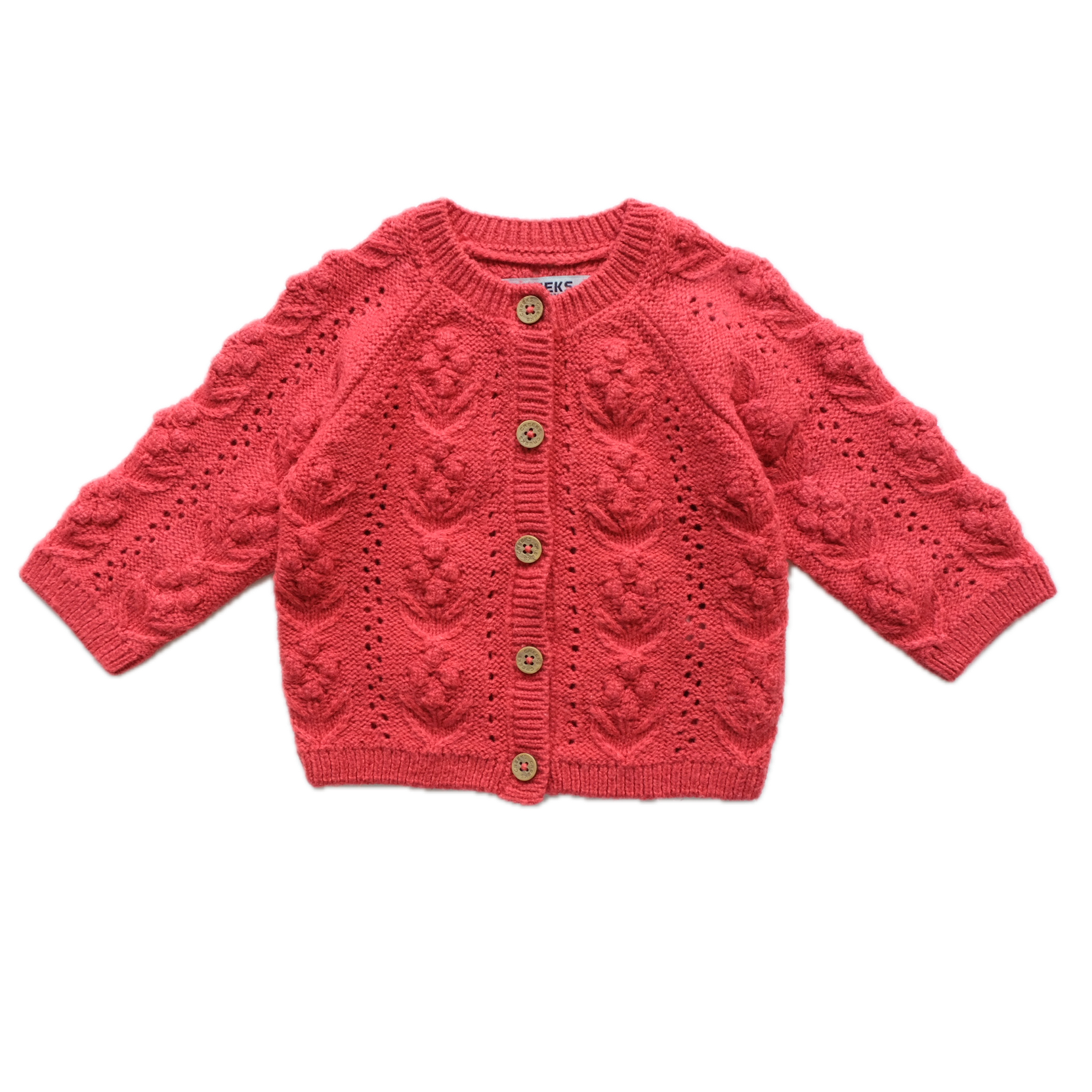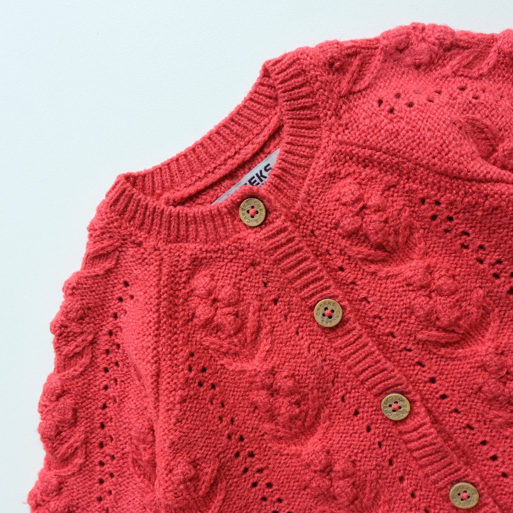 Gilet, cardigan à manches longues, maille ajourée, coloris rouge framboise uni. Boutonnière au devant.