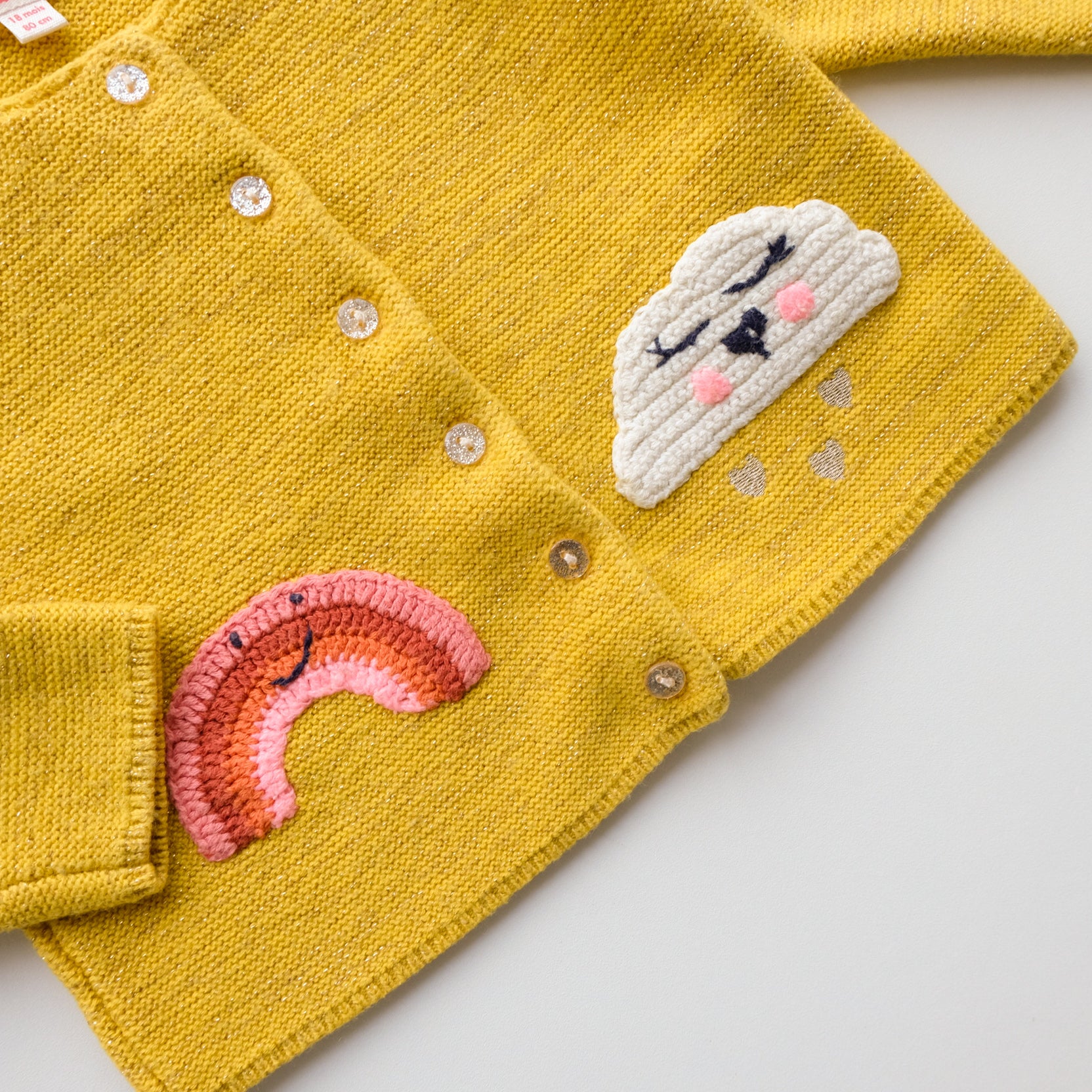 Gilet à manches longues en coton, maille point mousse. Coloris moutarde. Nuage et arc en ciel brodé au devant. Jolis boutons pailletés. Super mignon !