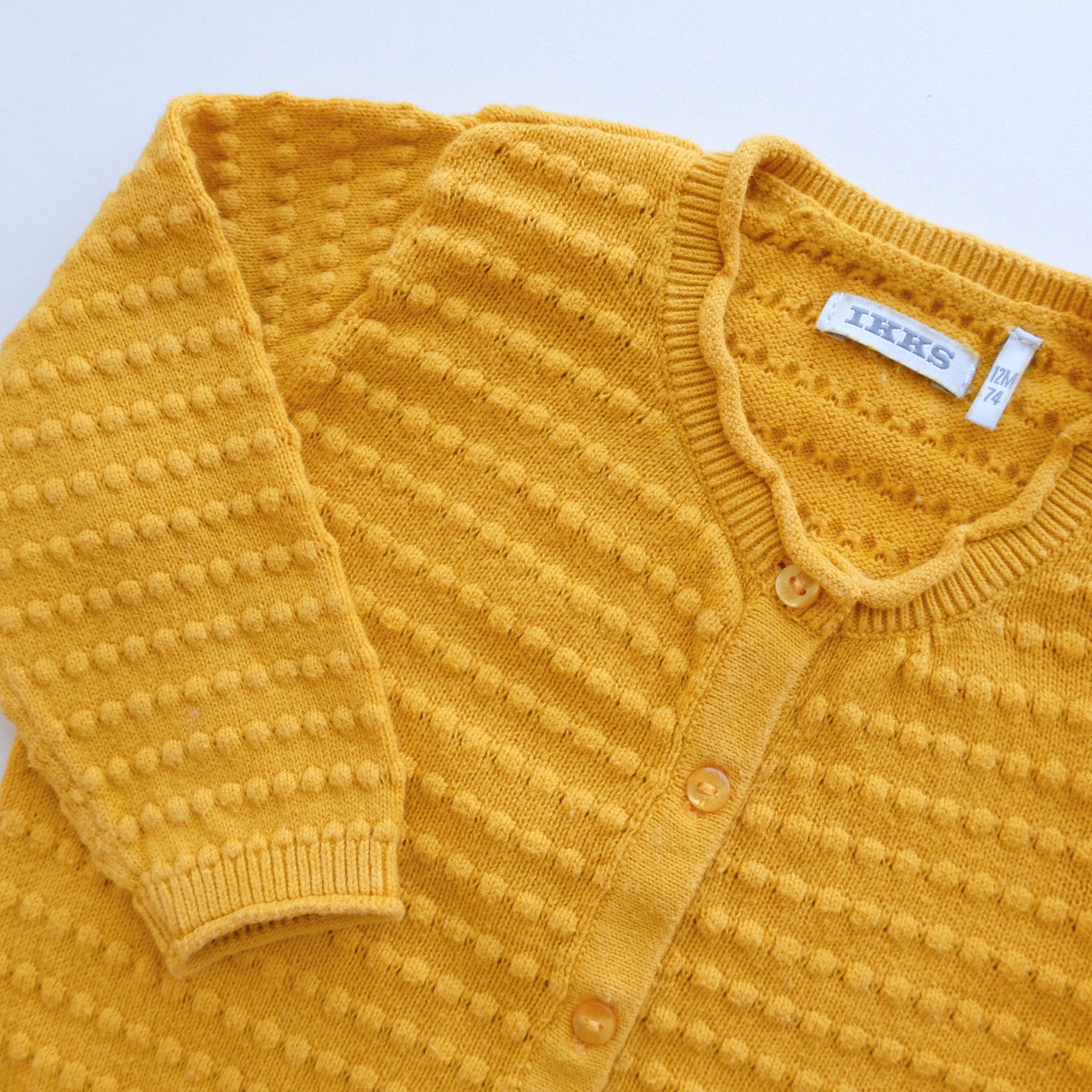 Gilet à manches longues en coton, coloris jaune moutarde. Bordures du col festonnées. Boutonnière au devant.