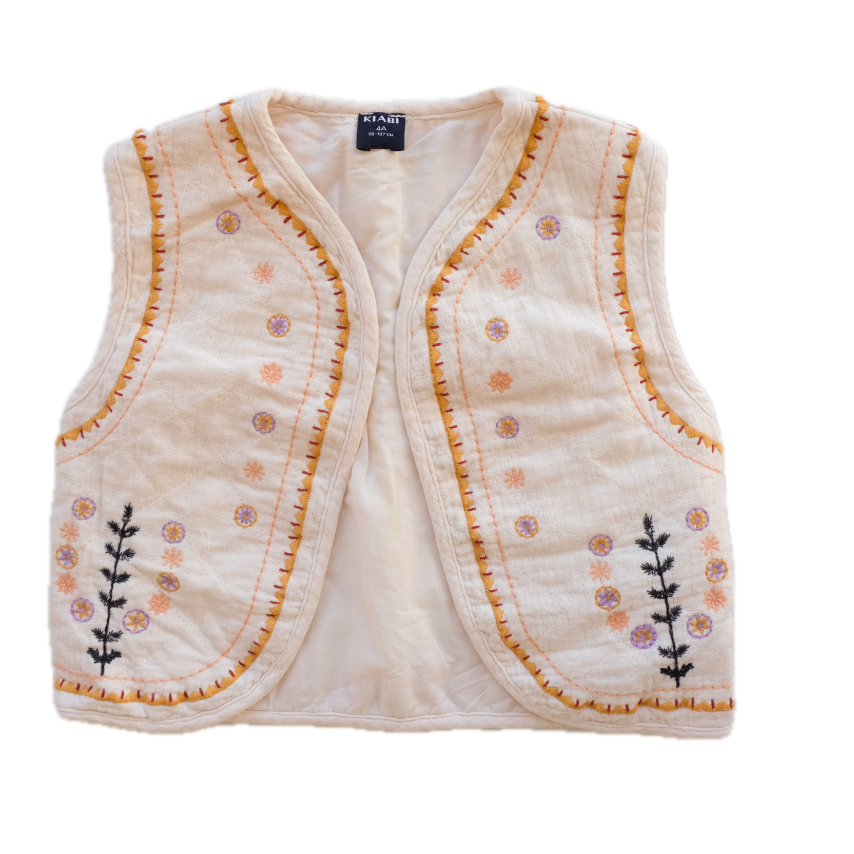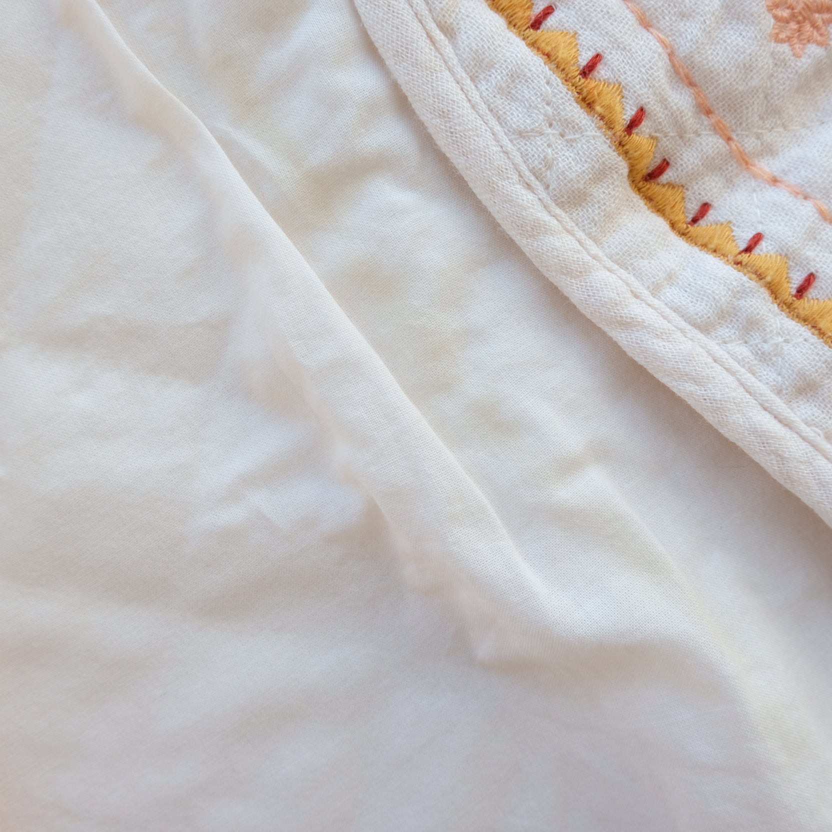 Gilet sans manches en gaze de coton, coloris vanille avec jolis détails brodés. Petite marque jaune au niveau de la pliure sur la doublure intérieure (donc ne se voit pas quand le gilet est porté).
