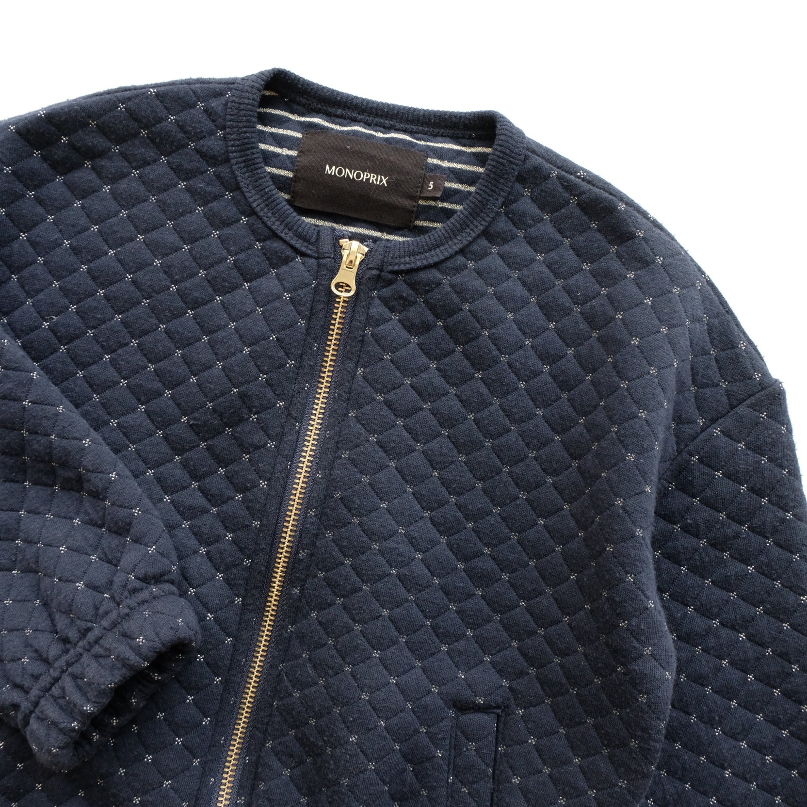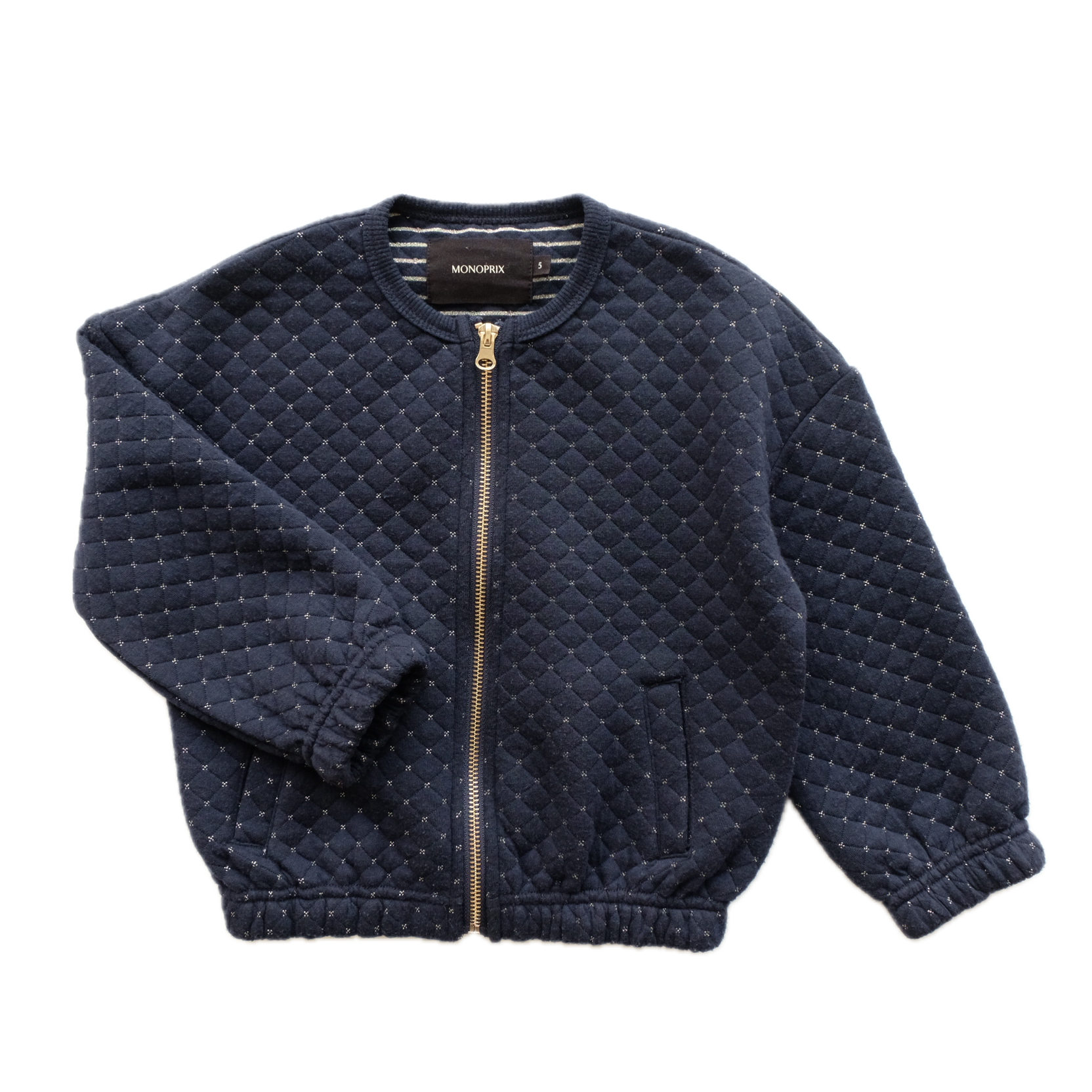 Gilet à manches longues en coton matelassé, tubique, coloris bleu marine avec petits détails dorés all over. Zip doré au devant.