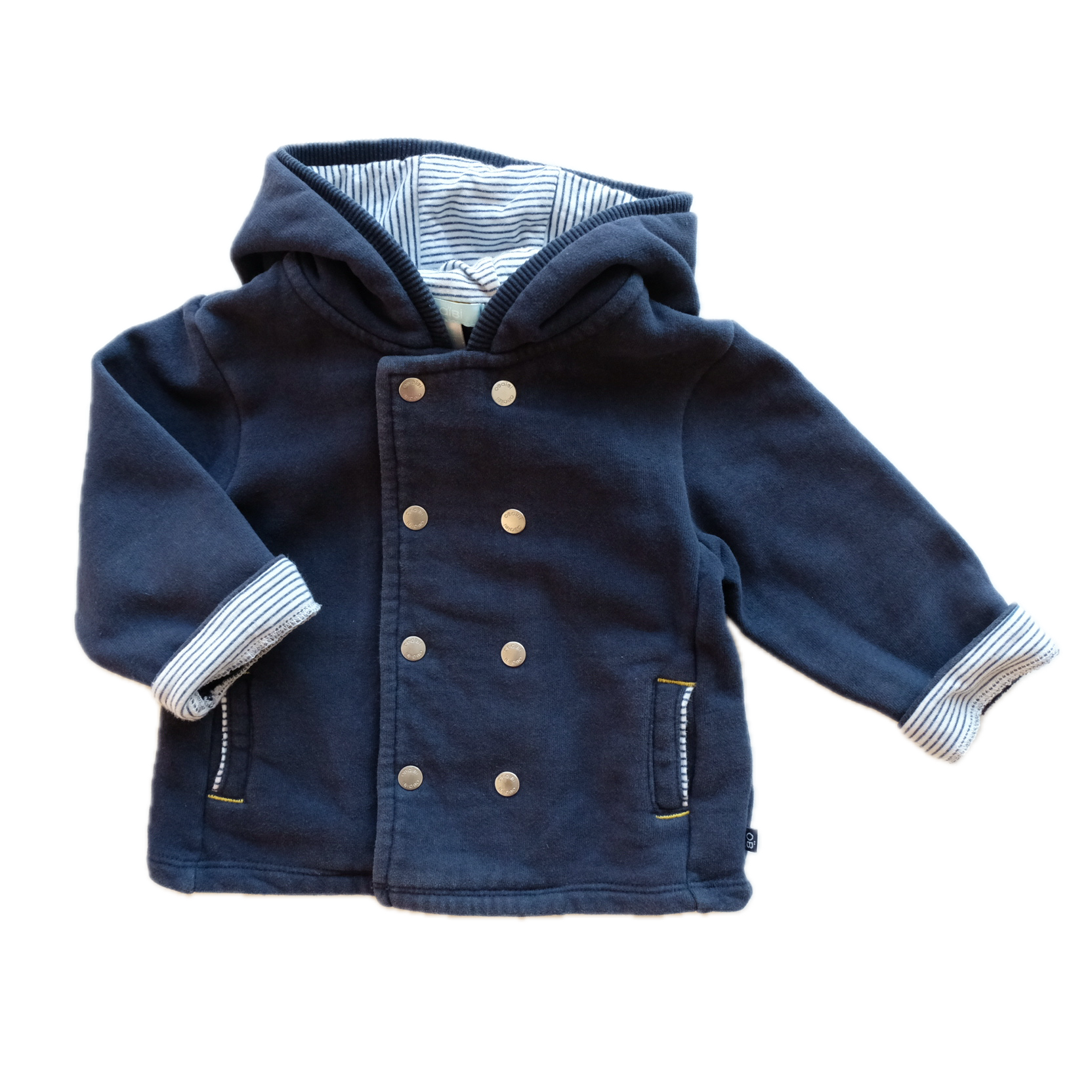 Gilet à manches longues en coton, coloris bleu marine. Capuche intégrée. Doublure intégrée en coton esprit marinière. Boutons pressions au devant. Très mignon !