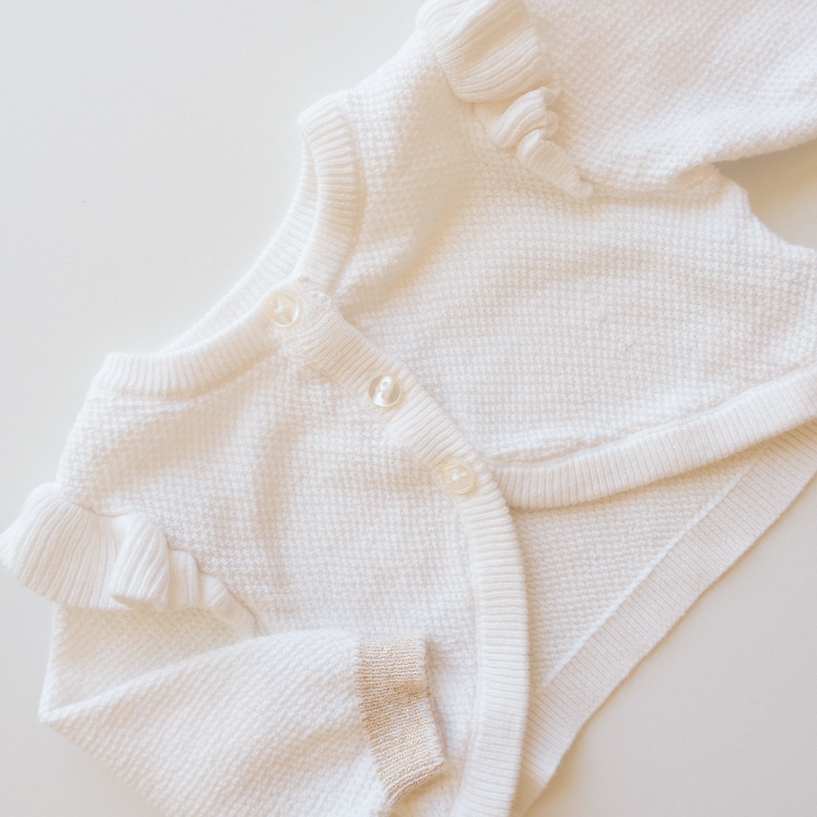 Gilet, cardigan, boléro à manches longues, coloris blanc et liseré doré sur la longueur des manches. Volanté aux épaules. boutonnière aux épaules. Très mignon !