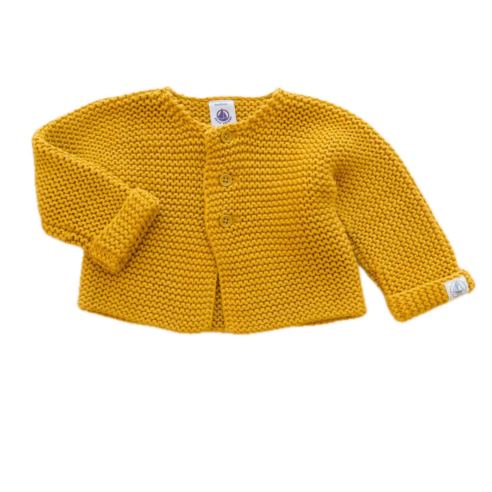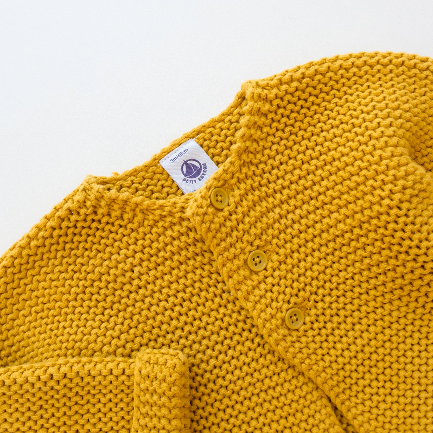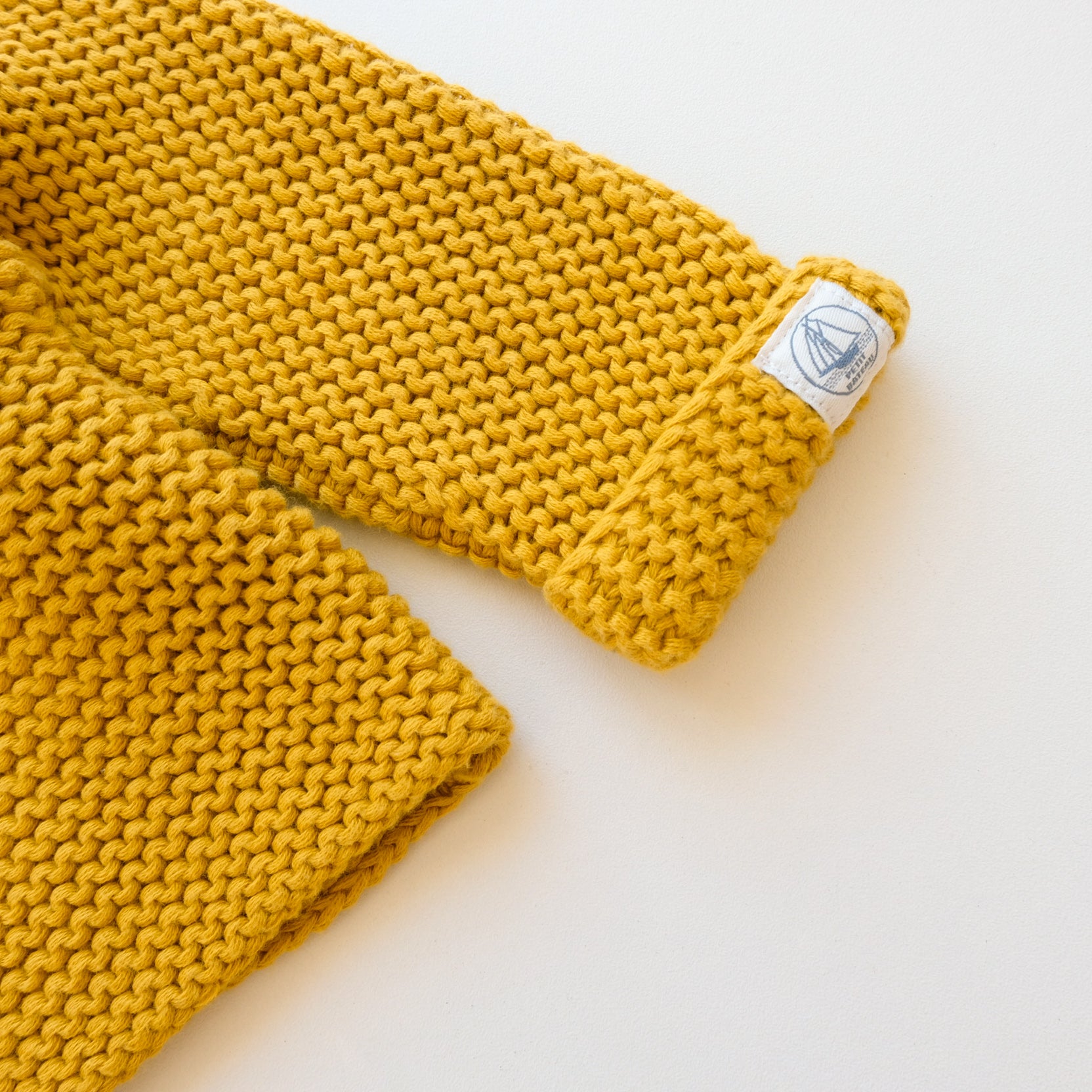 Gilet à manches longues en maille point mousse, coloris jaune moutarde uni. Trop mignon et super confortable pour bébé. Mixte.