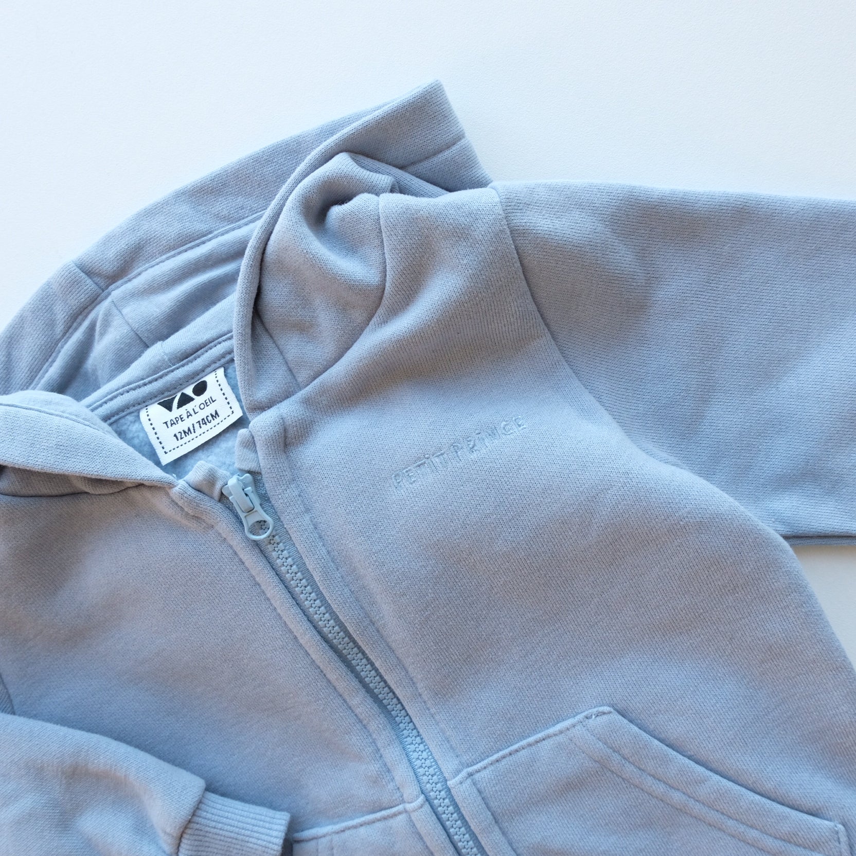Sweat, gilet à manches longues en coton, coloris bleu clair uni. Capuche intégrée. Zip au devant. doublure intérieure en molleton. Inscription "Petit prince" ton sur ton brodée au devant.