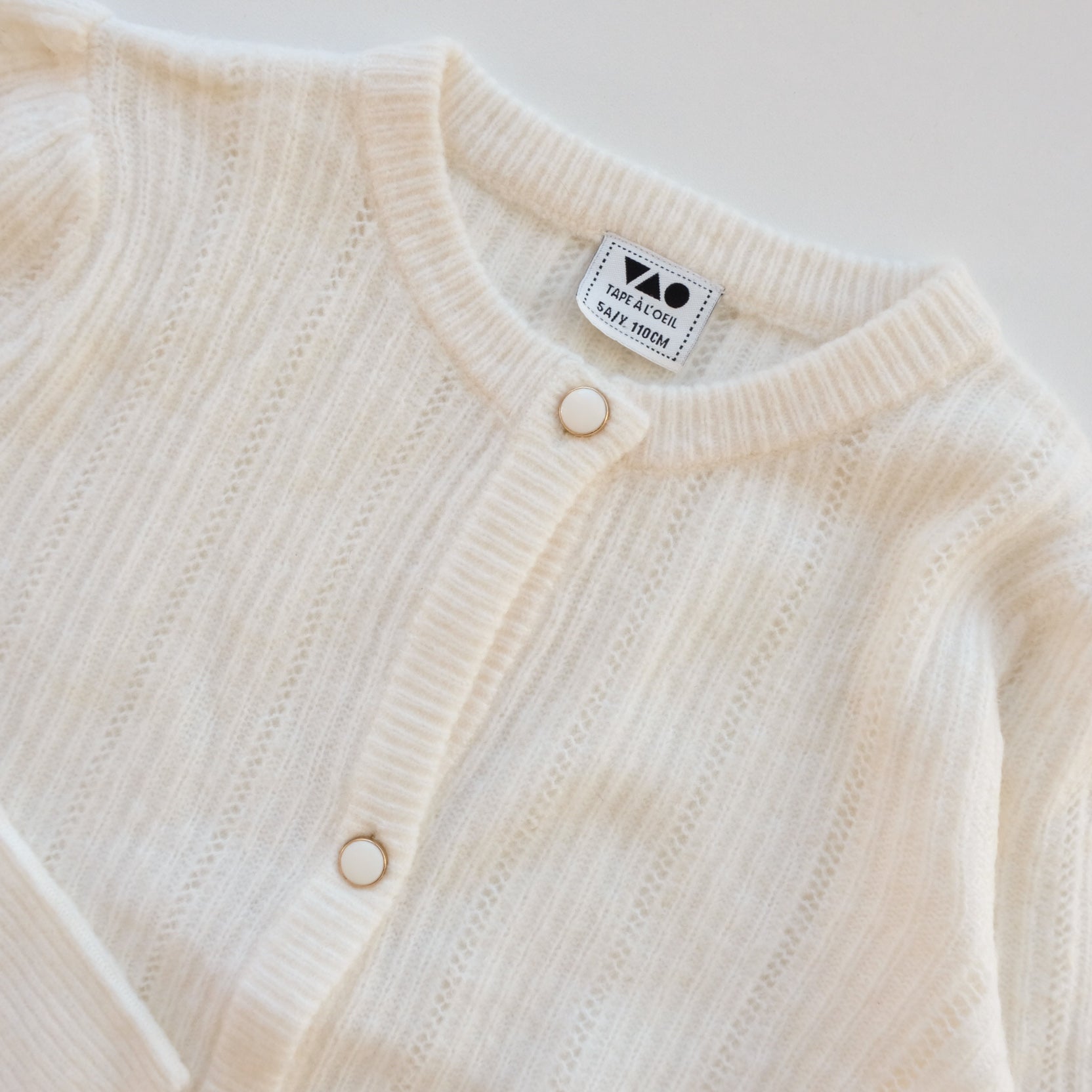 Gilet, cardigan, maille à manches longues, coloris crème. Détails ajourés all over. Jolie boutons blanc et dorés. Contient 3% de laine. Superbe !