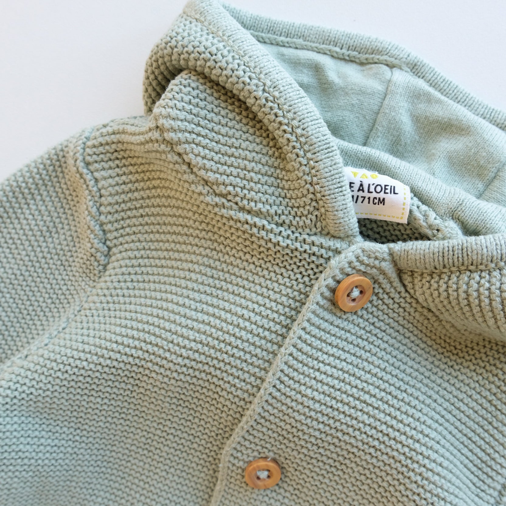 Gilet à manches longues en coton, coloris vert d'eau / menthe uni. Maille point mousse, capuche intégrée, boutonnière au devant.