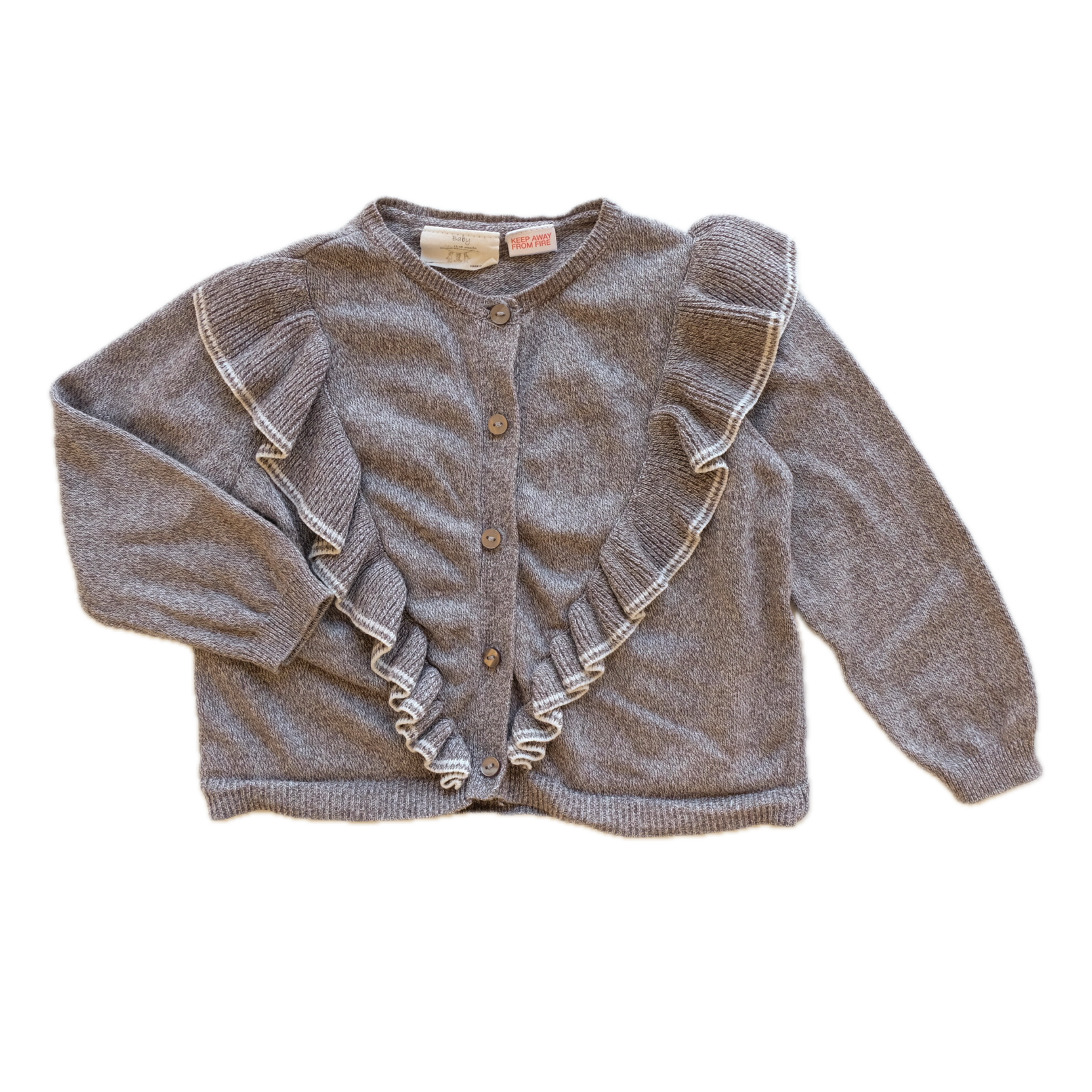 Gilet, maille à manches longues coloris gris et blanc. Beaux volants et boutonnière au devant. Très chouette !
