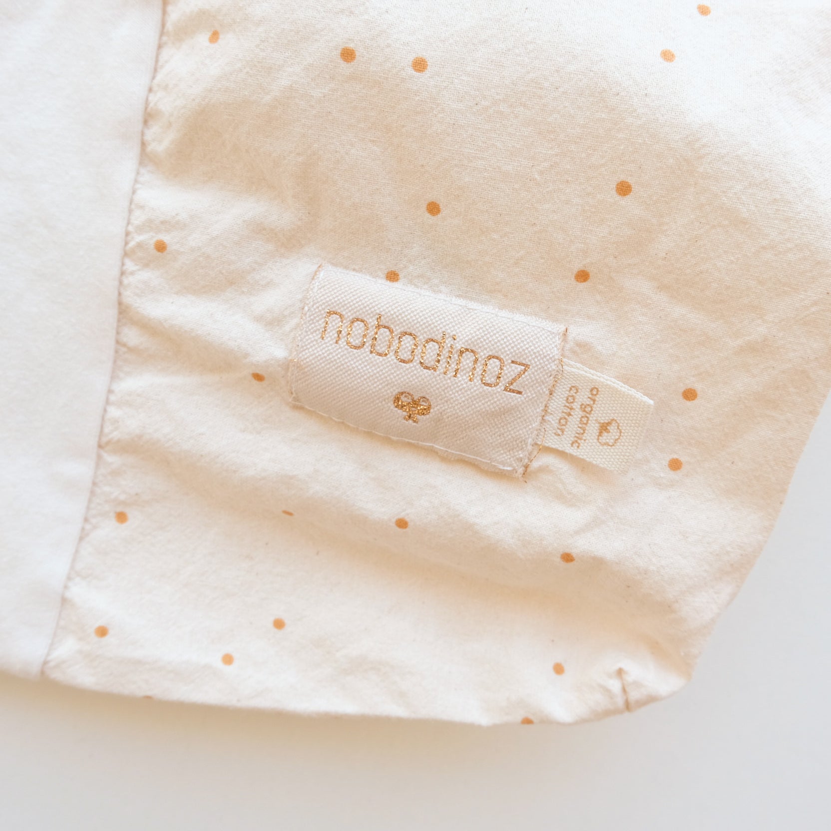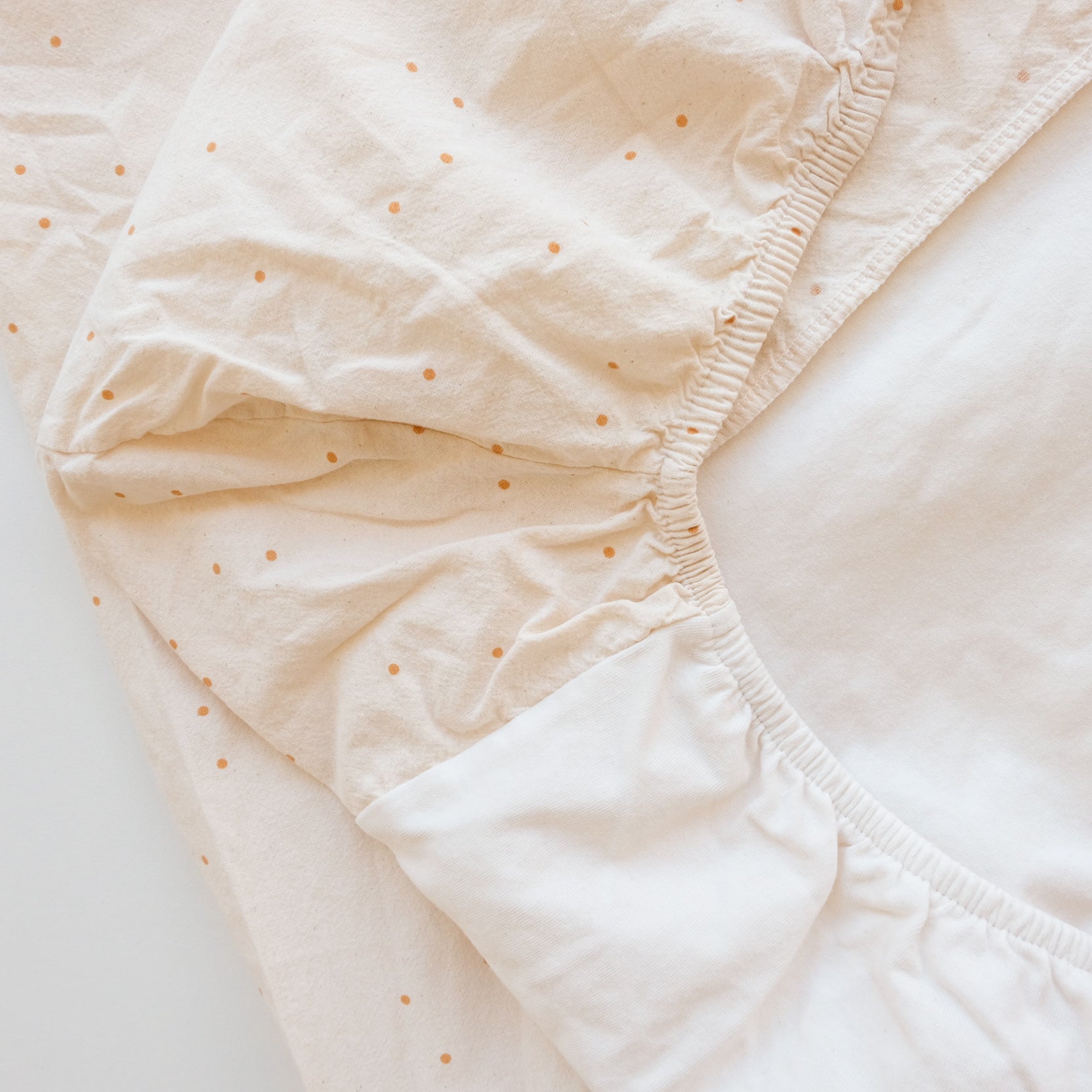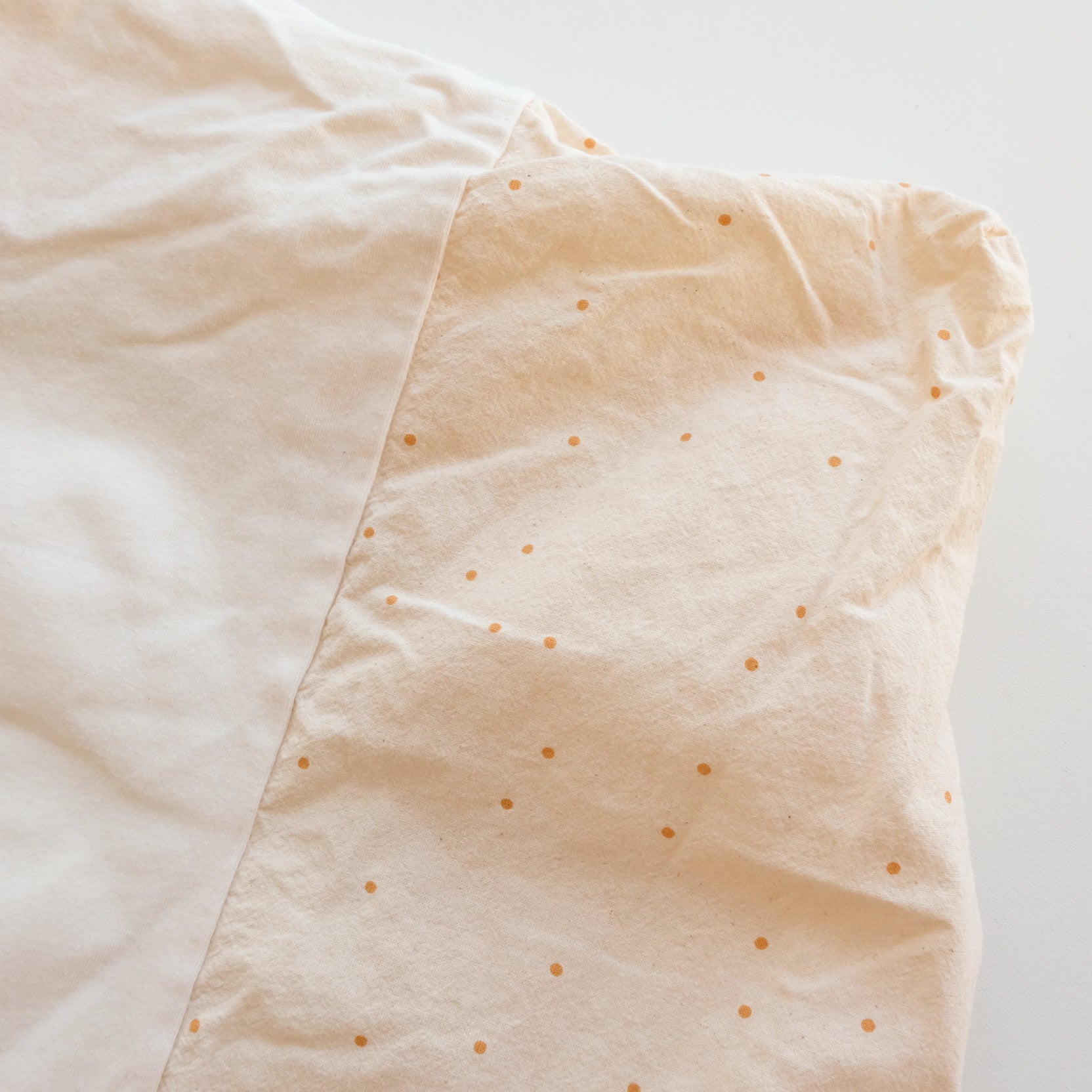 Drap housse pour matelas à langer en coton biologique, coloris vanille et écru, imprimé petits pois coloris moutarde. Mixte. Fabriqué en Espagne. Dimensions : 50x70cm.