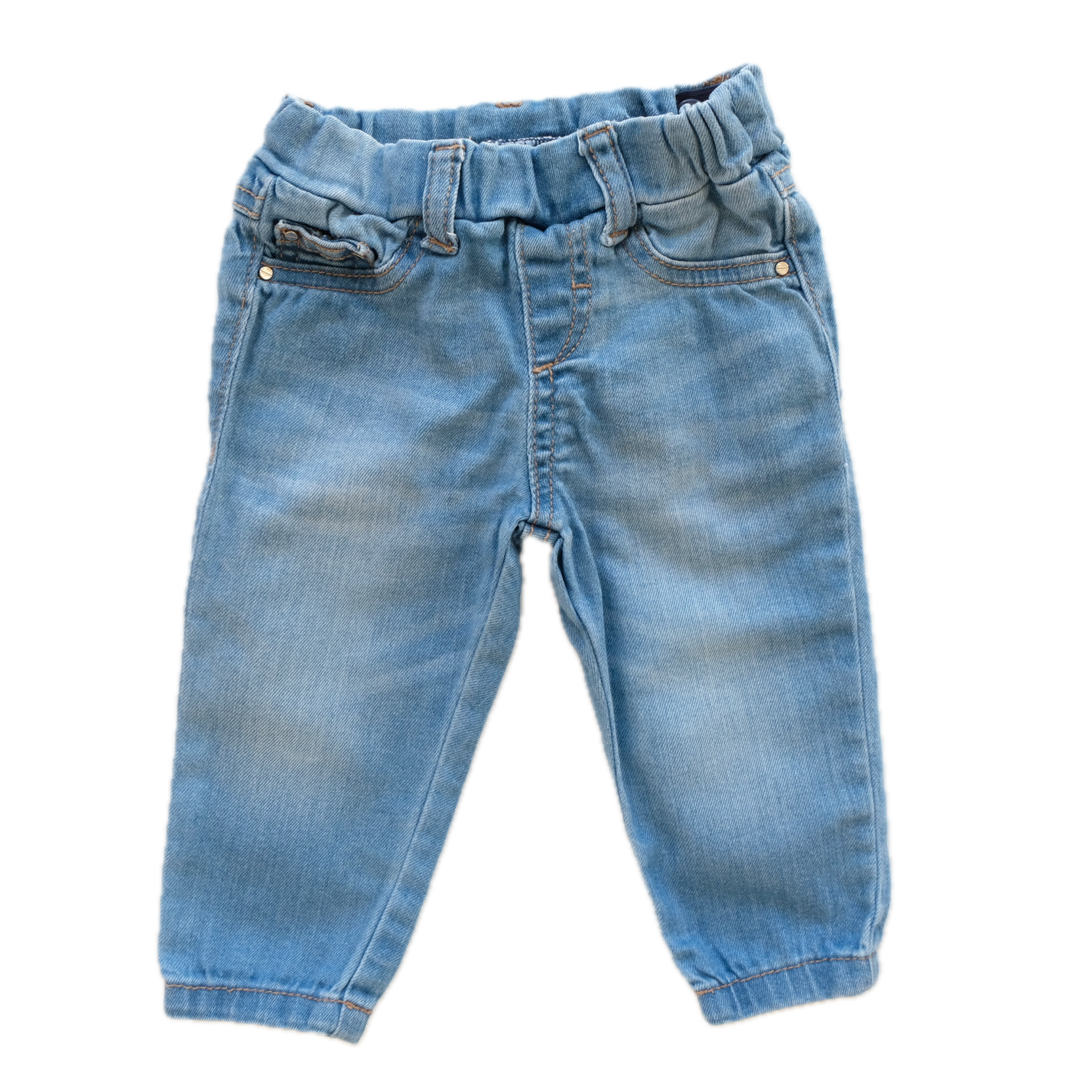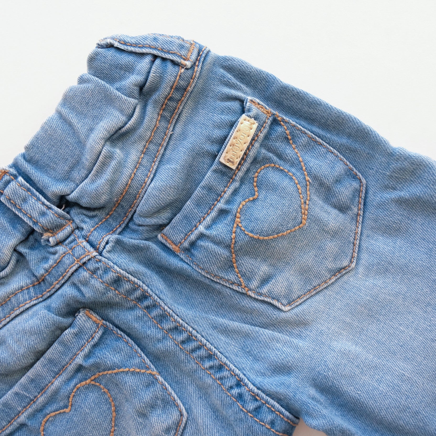 Jean coloris bleu clair, taille élastiquée ajustable.