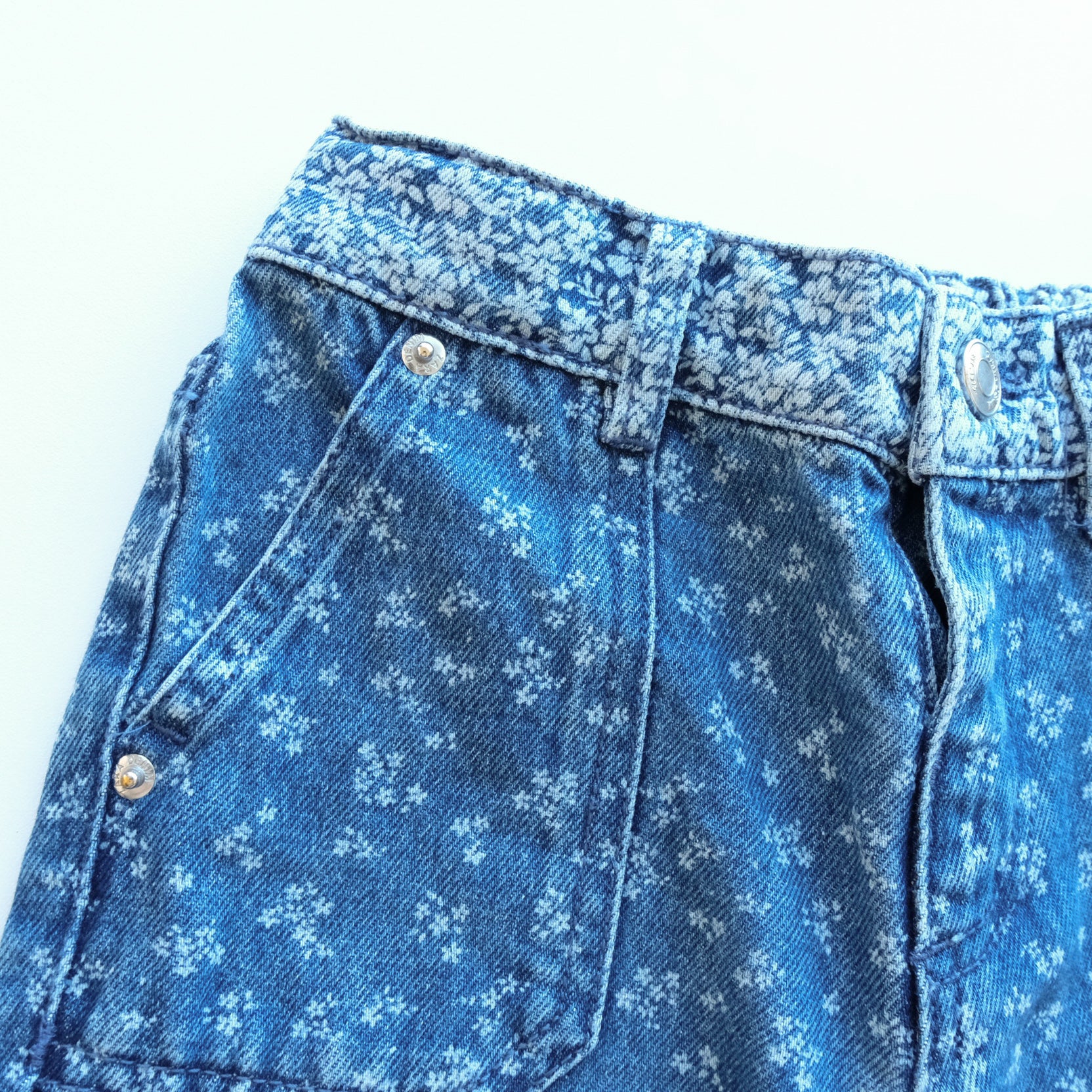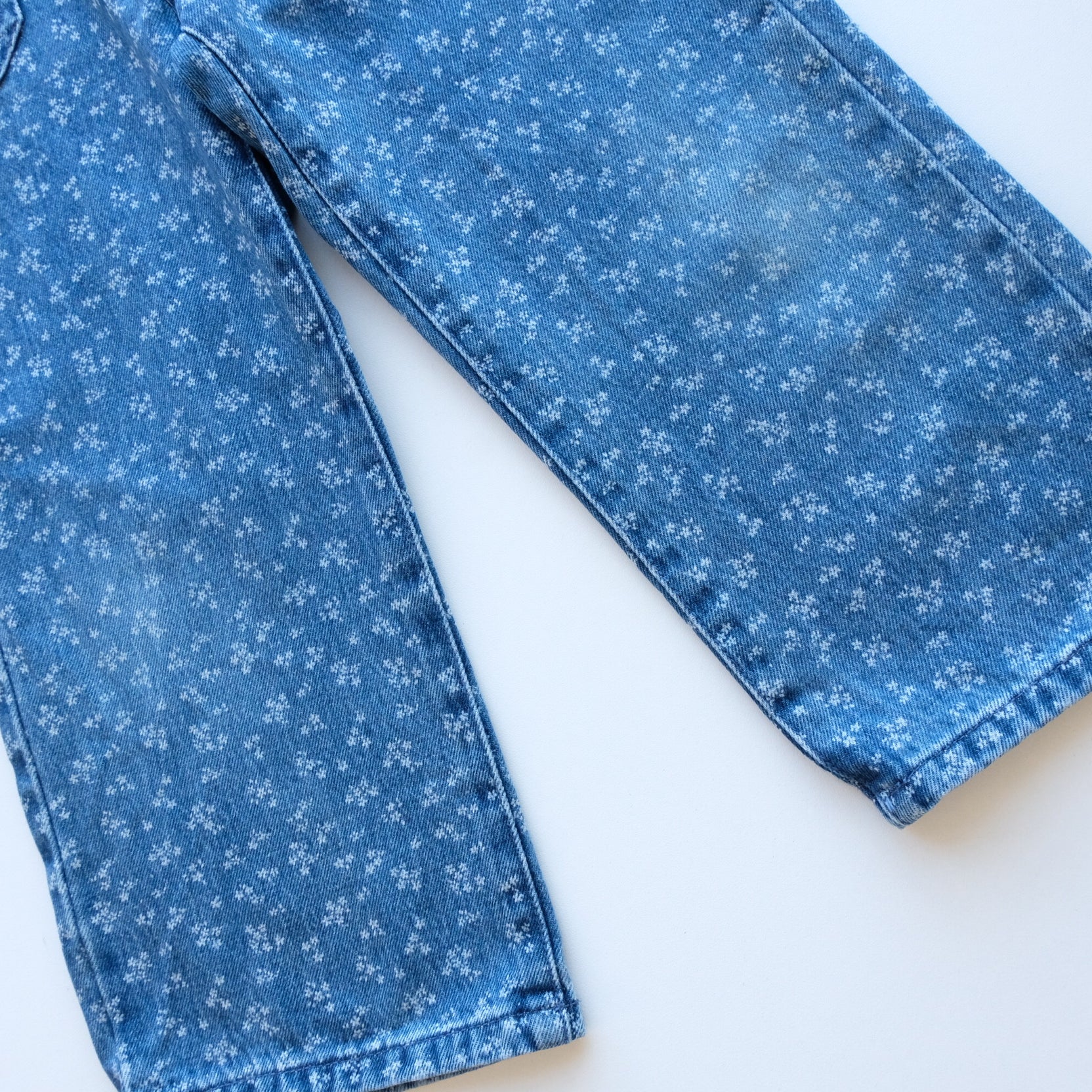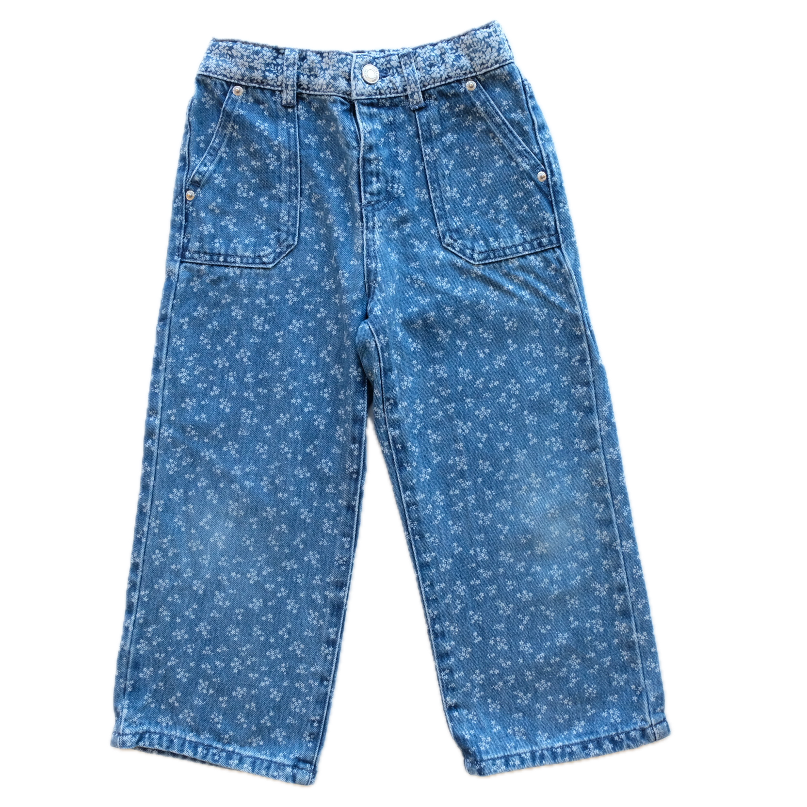 Jean coupe large, coloris bleu, imprimé fleuri all over. Taille ajustable. Légèrement blanchi au niveau des genoux.