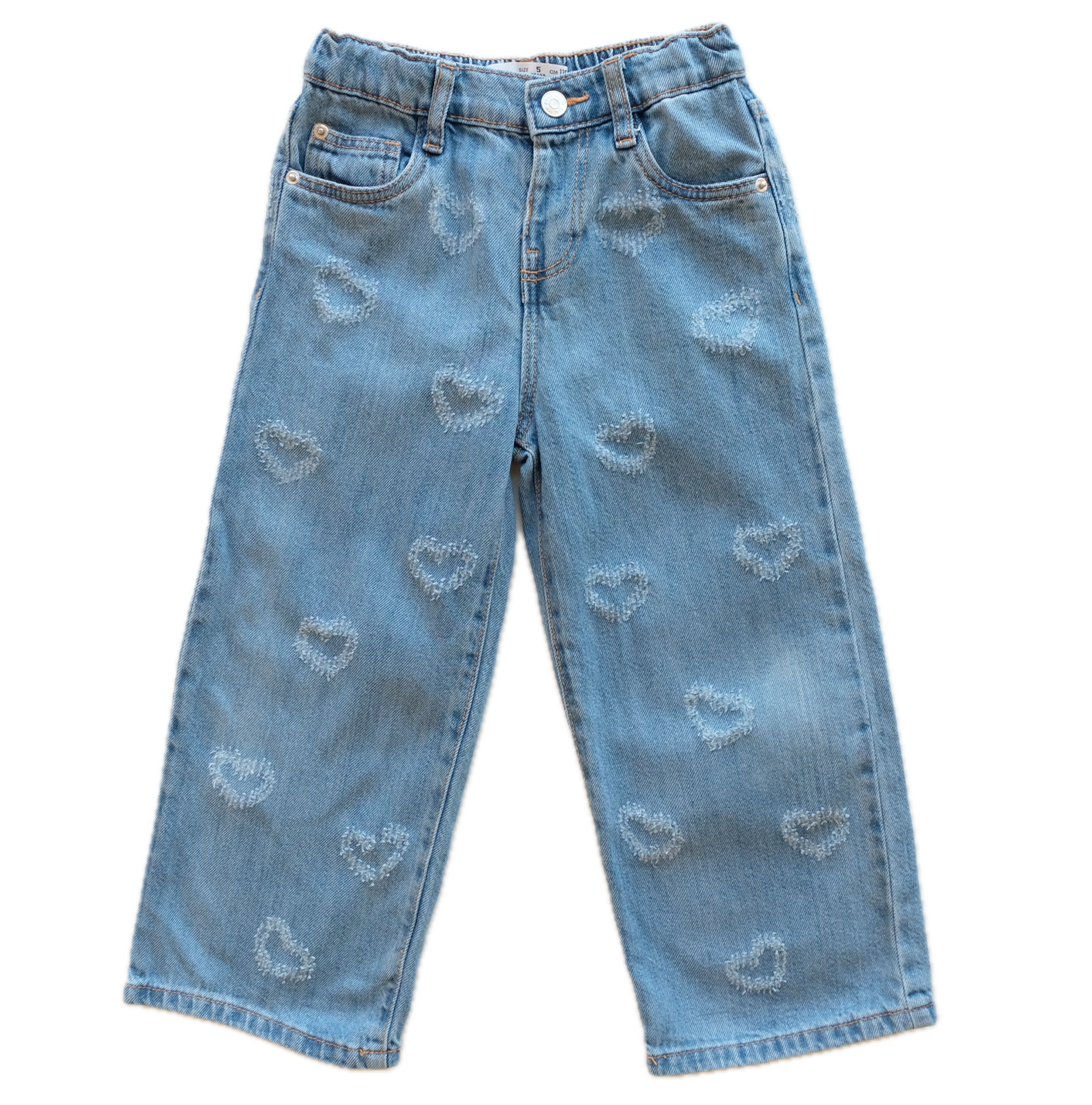 Jean, coupe large coloris bleu. Motifs coeurs intégrés à la toile de jean. Taille ajustable. Très chouette !