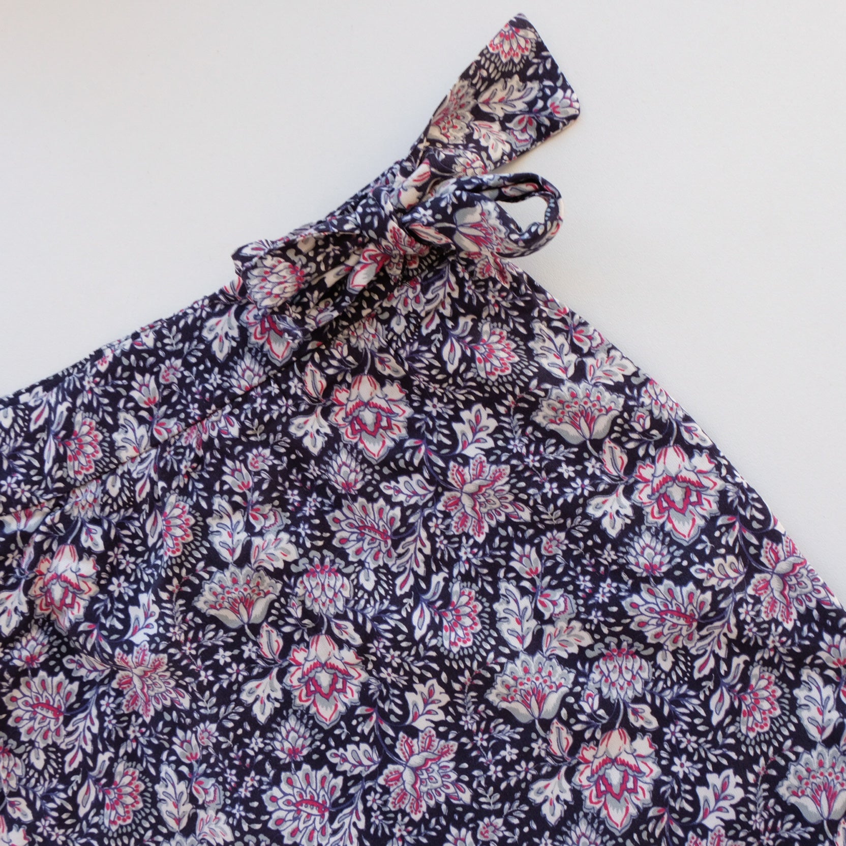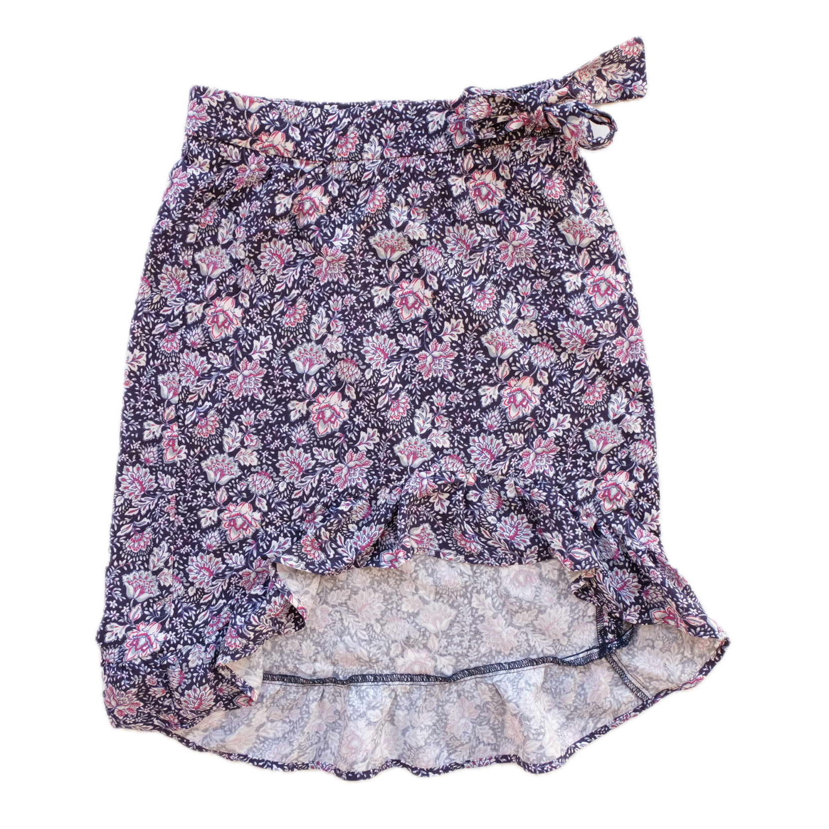 Jupe fluide mi-longue en viscose dans les tons bleu, blanc, rose. Imprimé cachemire all over. Ceinture à nouer sur le côté.Taille ajustable. Très chouette !