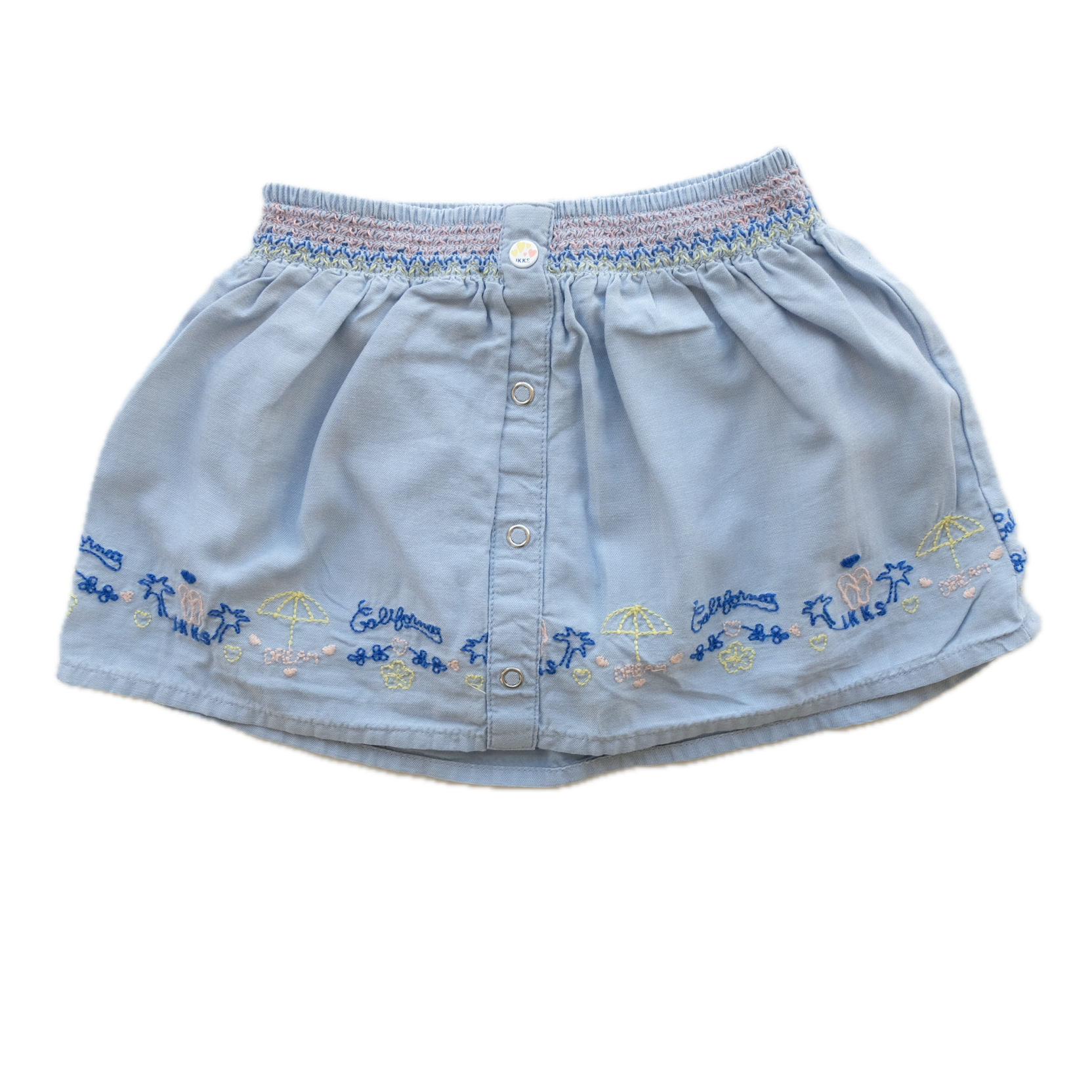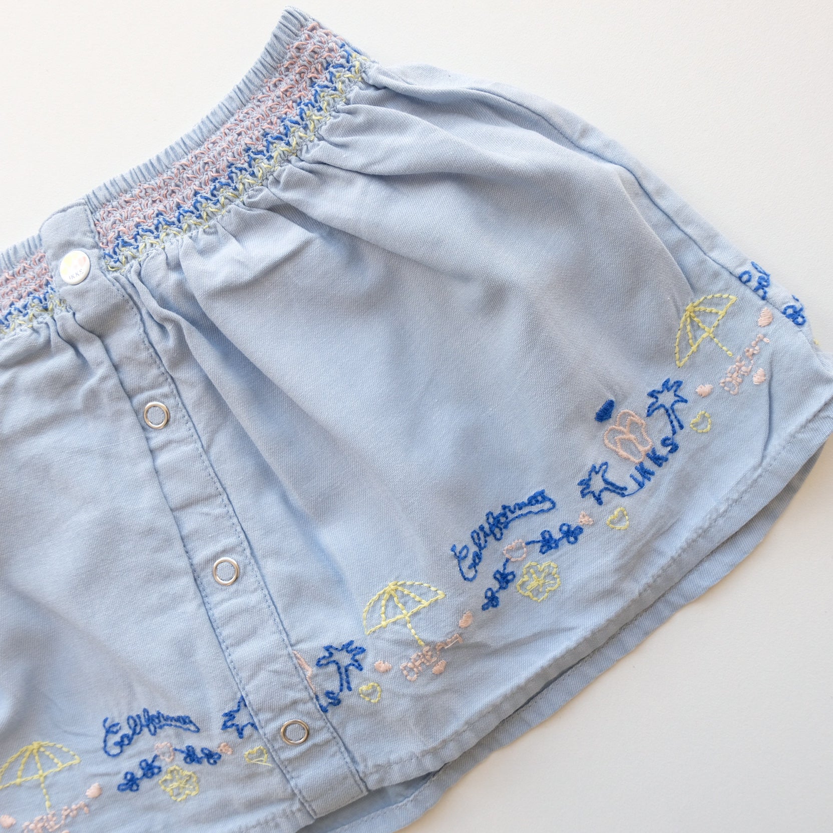 Adorable petite jupe en coton et lyocell, coloris bleu clair avec d'adorables petites broderies sur le thème des vacances. Un petit cycliste blanc confortable pour bébé est intégré à la jupe. Trop mignonne !