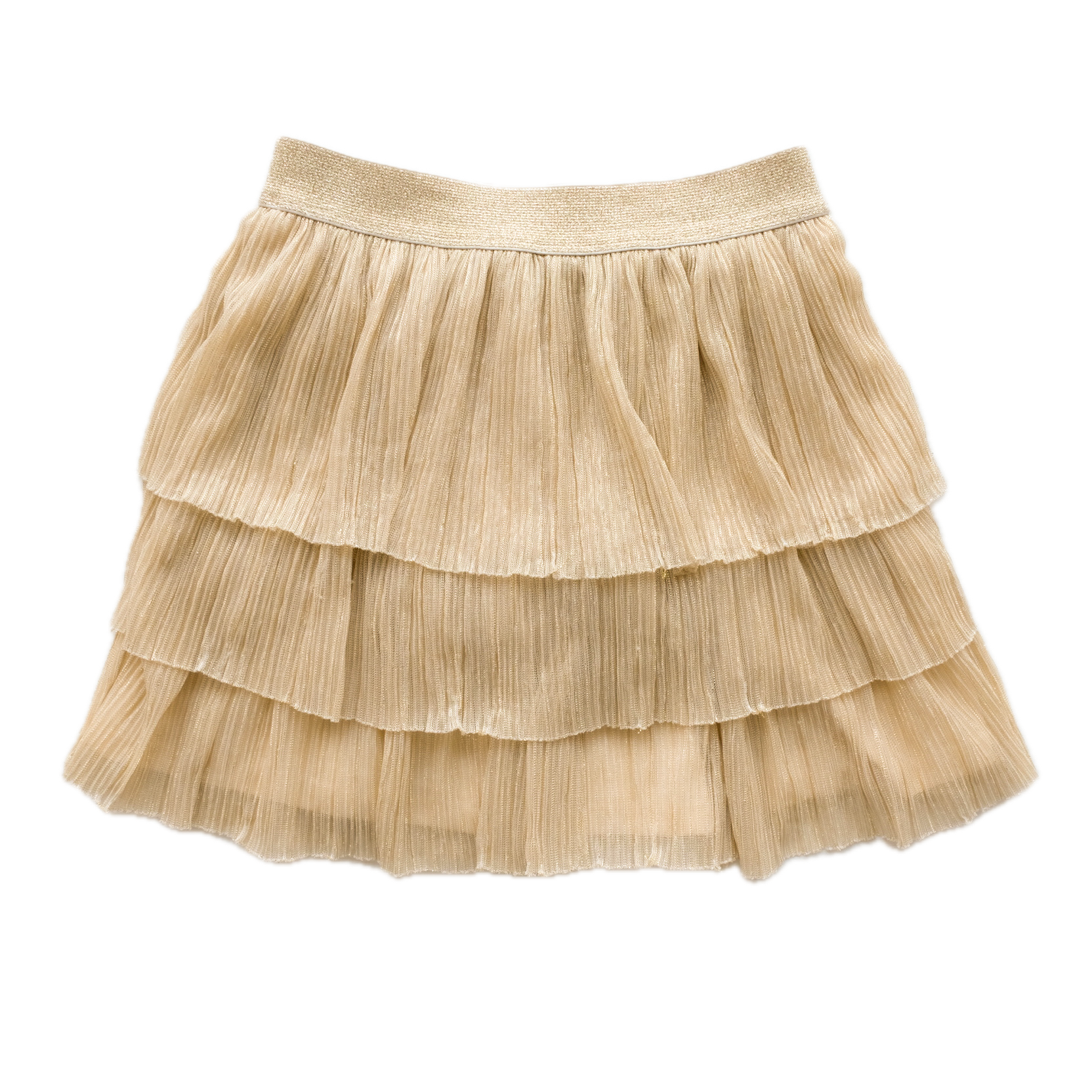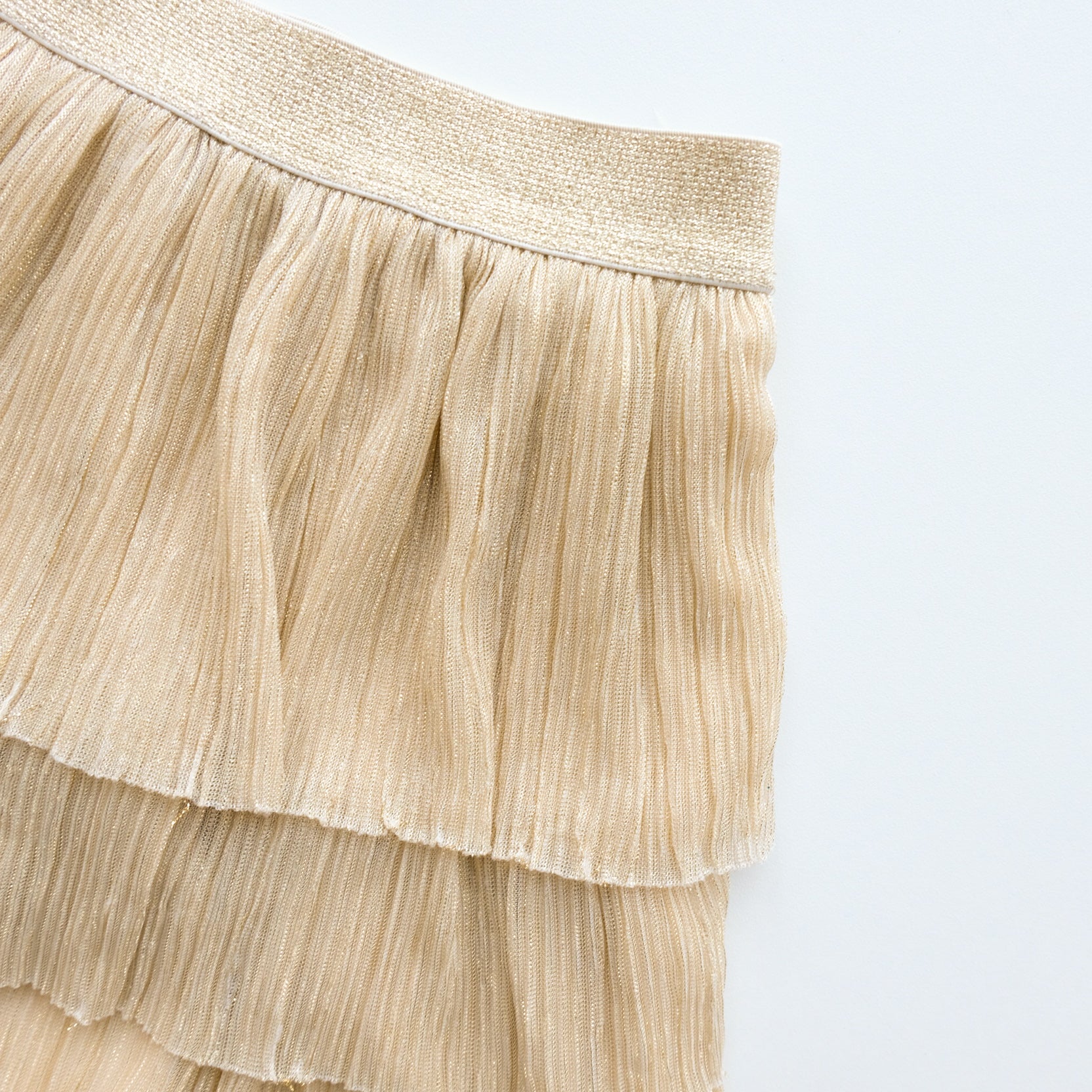 Jupe courte en tulle plissé doré. Élastique doré à la taille. Plusieurs rangées de volants. Très mignonne. Parfaite pour une tenue de fête.