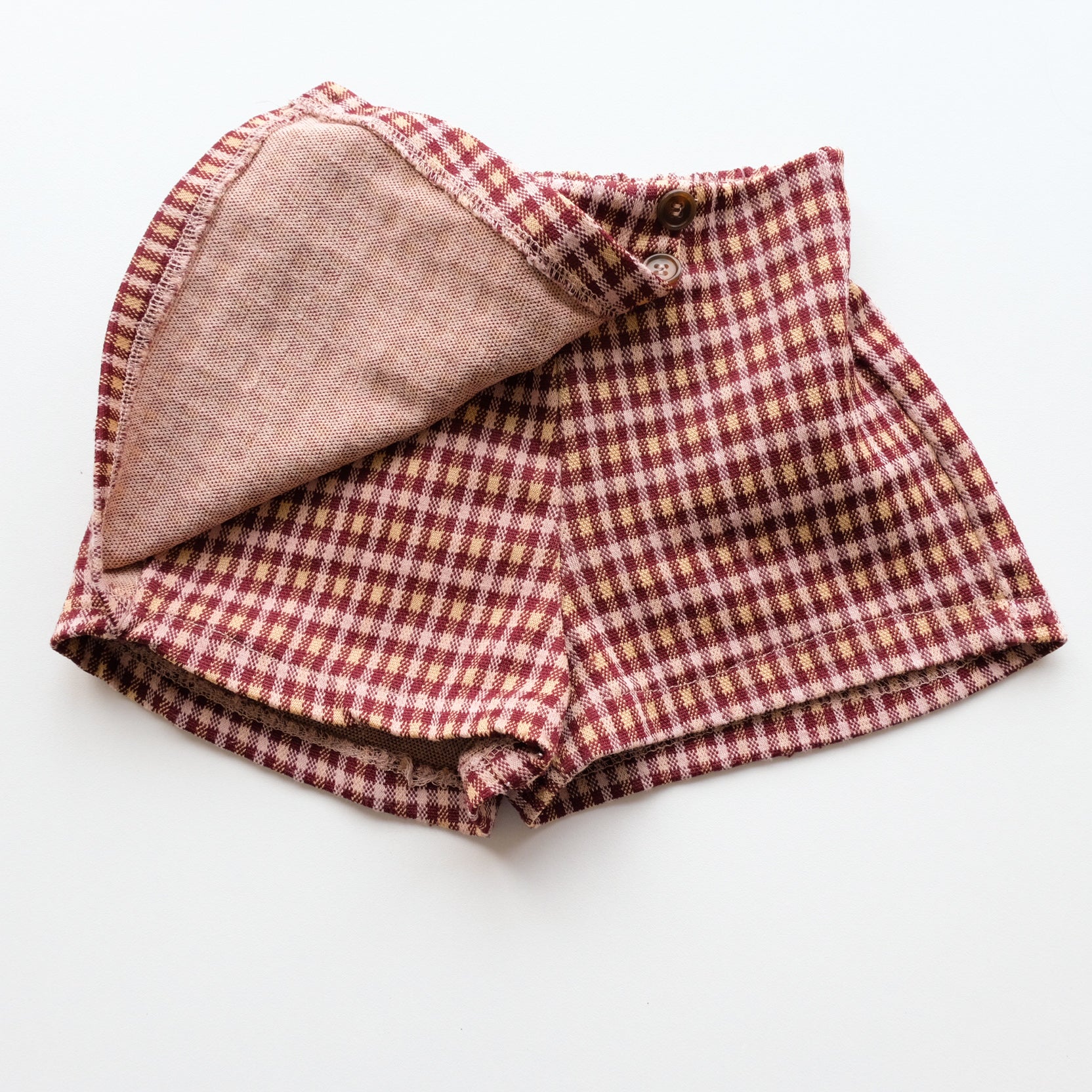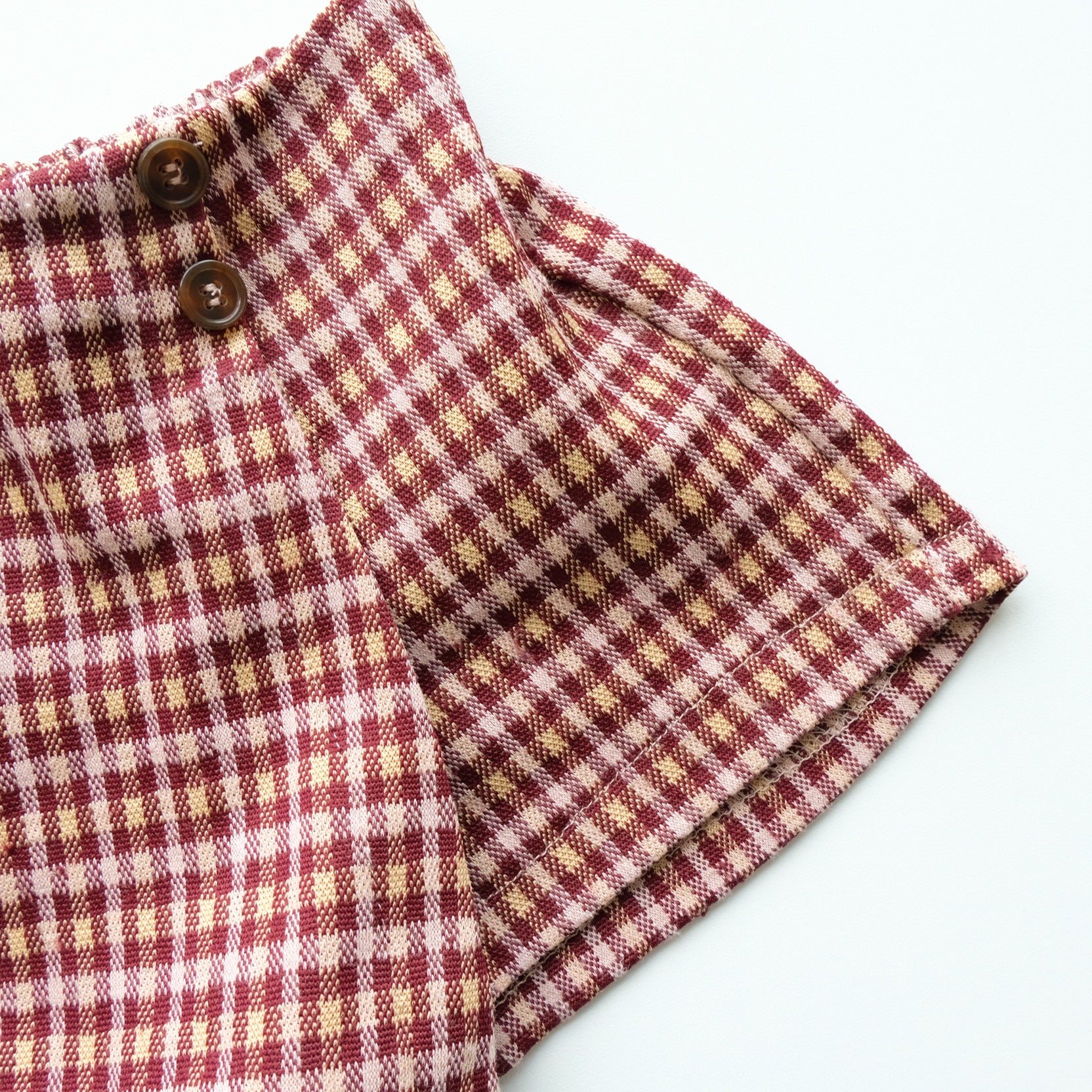 Jupe short, imprimé petits carreaux, coloris bordeaux, rose et jaune.