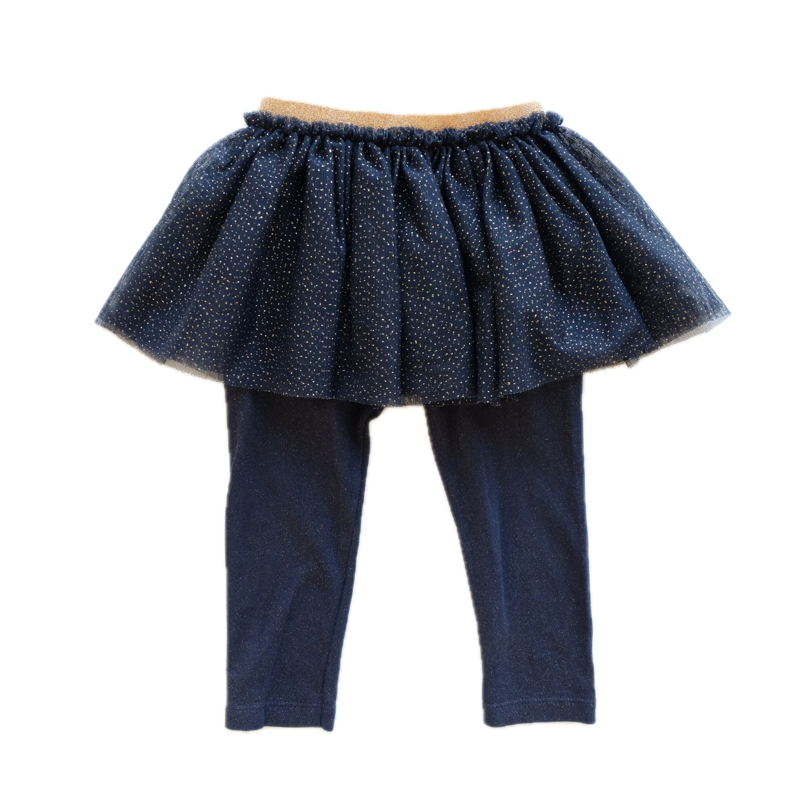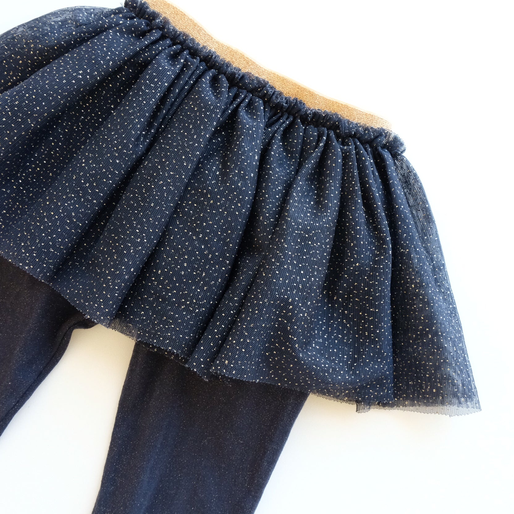 Legging en coton avec jupe en tulle intégrée. Coloris bleu marine et paillettes dorées all over. Élastique à la taille doré.