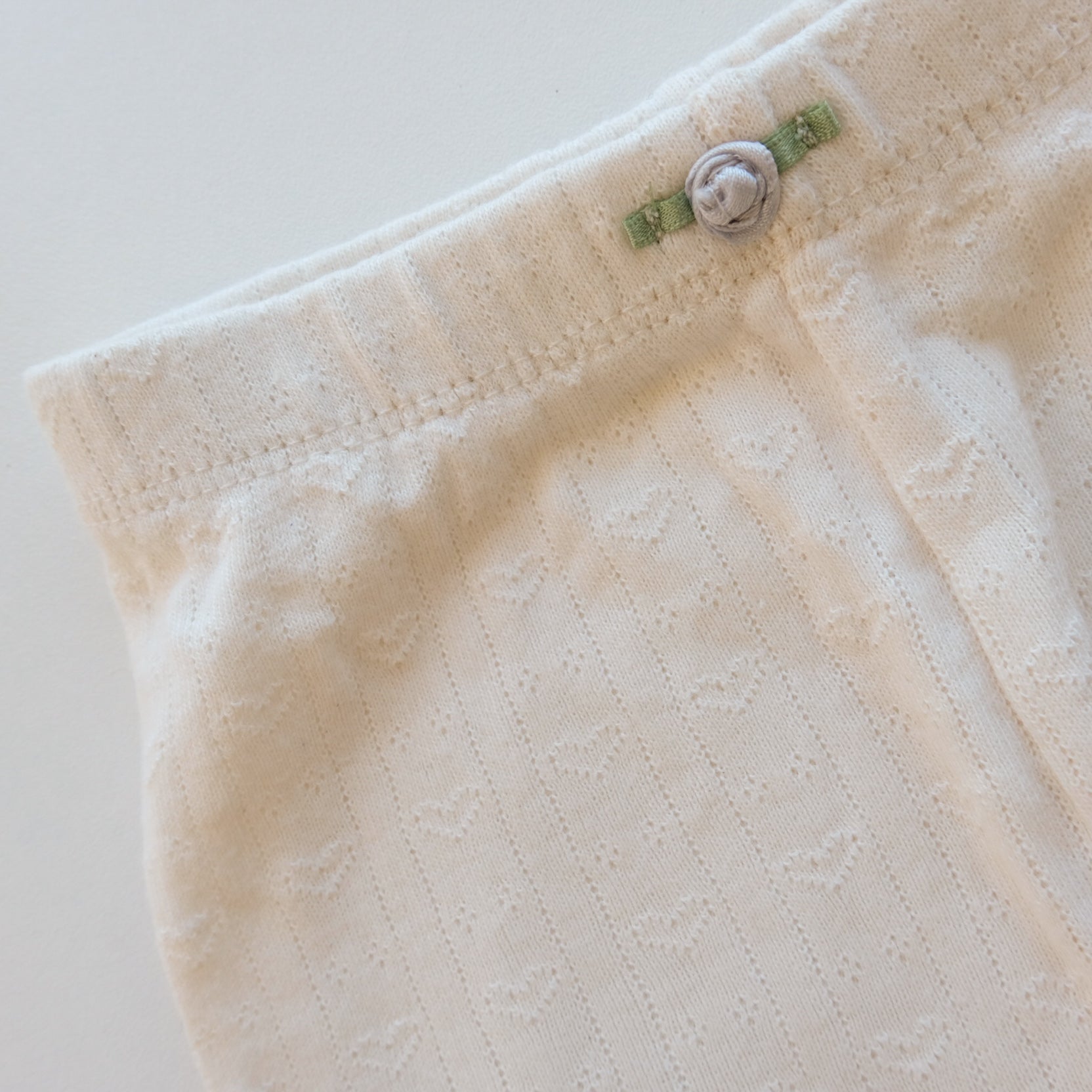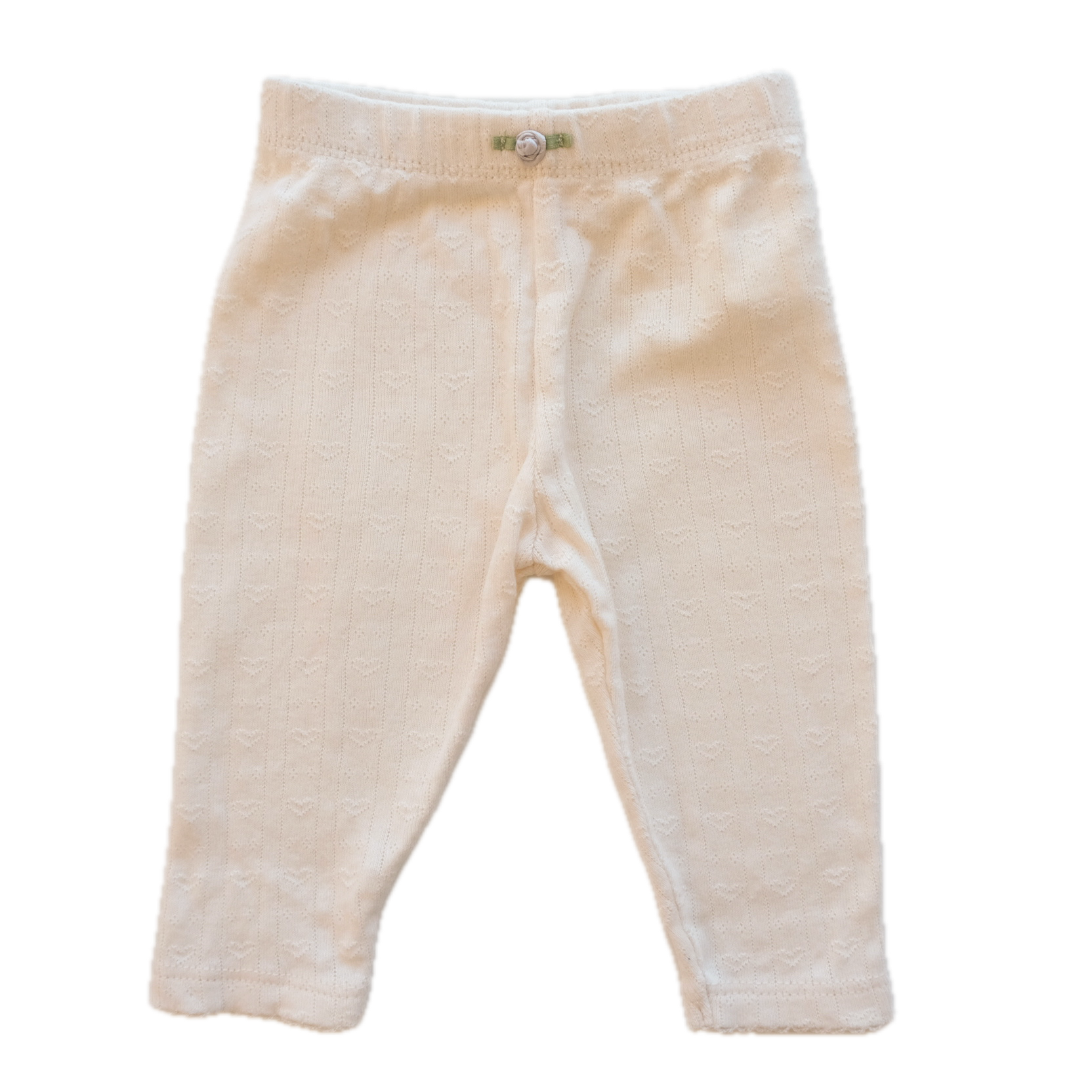 Legging en coton côtelé, coloris vanille, détails coeurs ajourés all over. Petite feur cousue à la taille. super mignon !