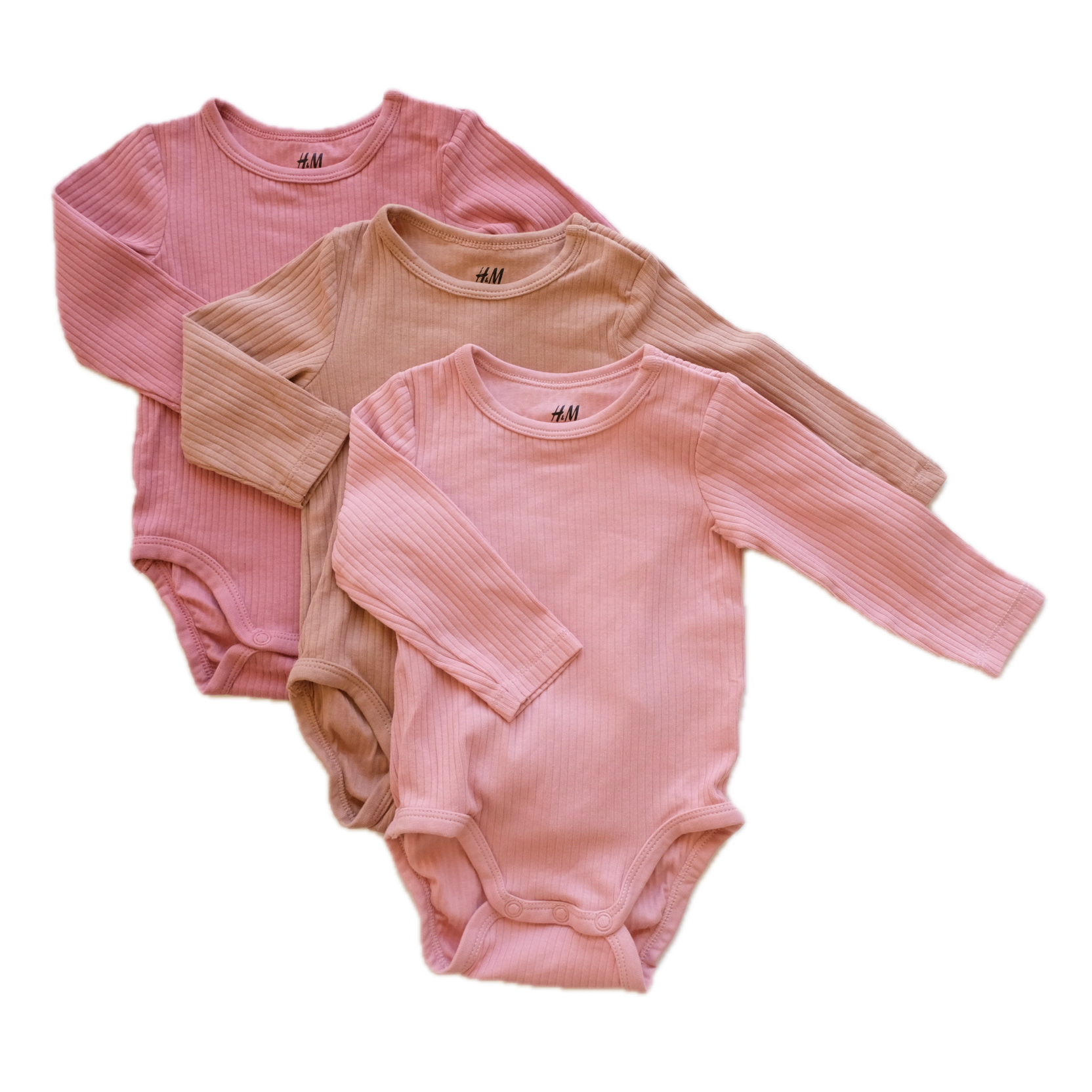 Lot de 3 bodies à manches longues en coton côtelé biologique, coloris rose uni.
