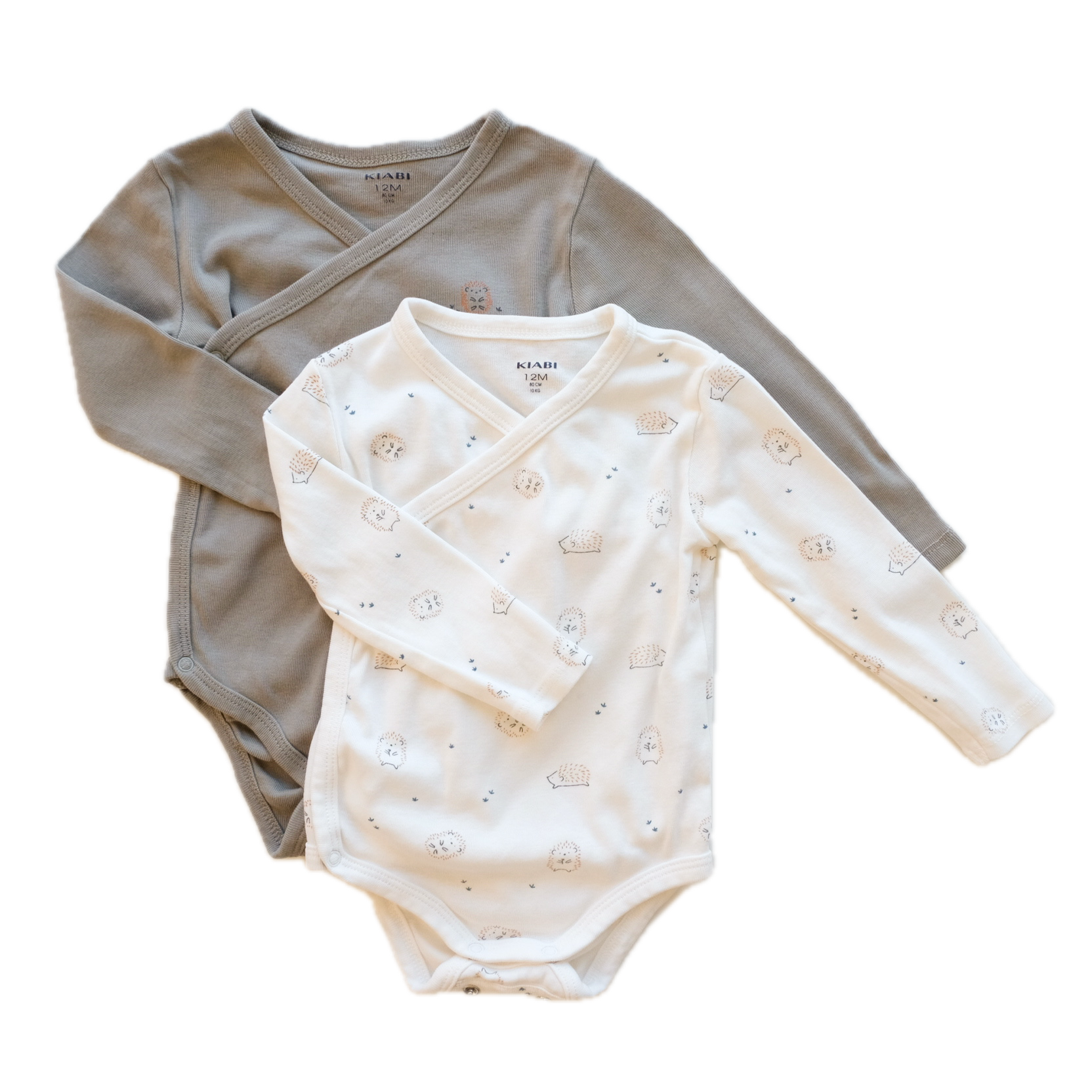 Lot de 2 bodies croisés à manches longues en coton. Un body coloris blanc, imprimé hérissons all over, et un body vert foncé, petit hérisson imprimé hérisson. Super mignons. Mixtes.