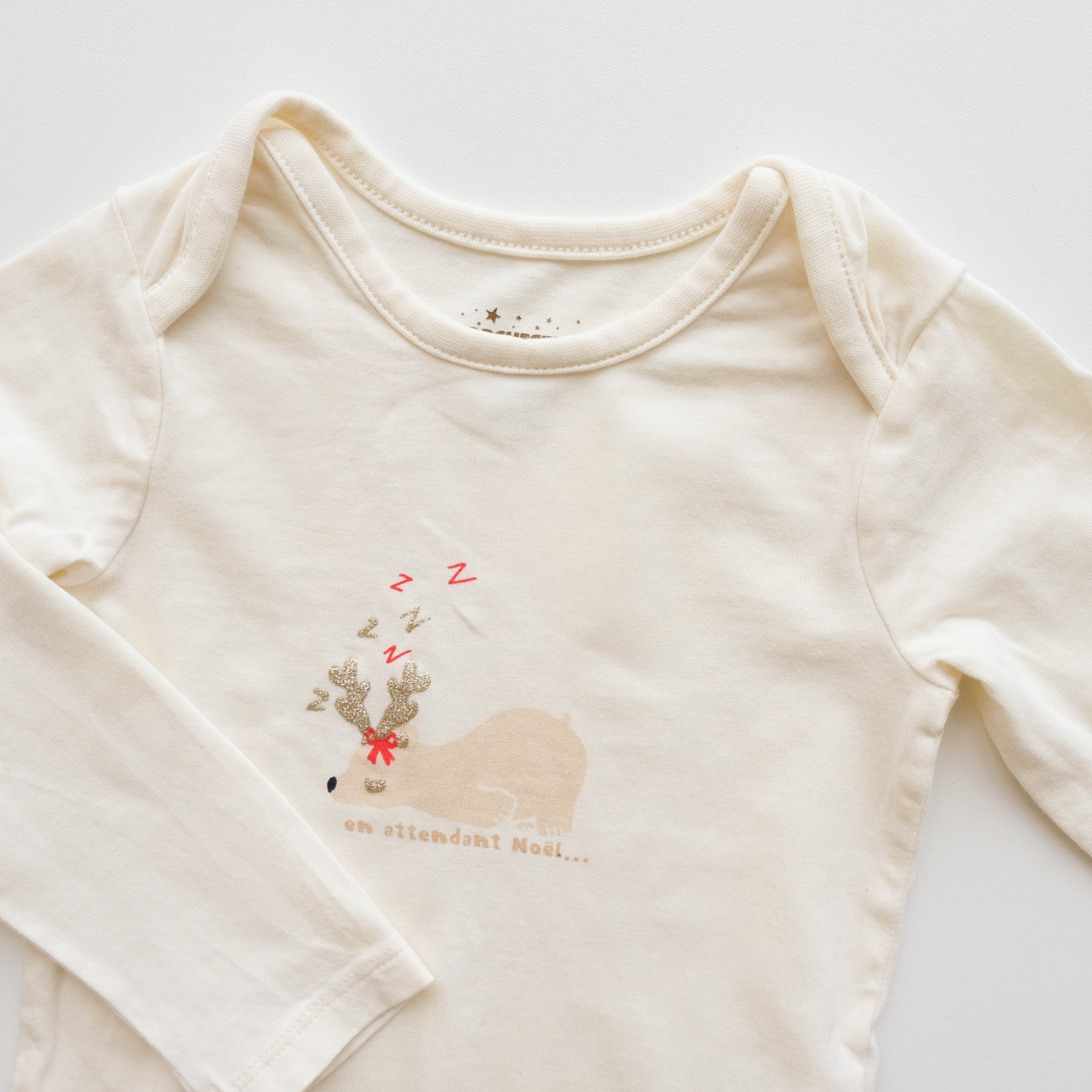 Body à manches longues en coton, coloris crème, touches de rouges et dorés. Imprimé thème noël. Encolure américaine.