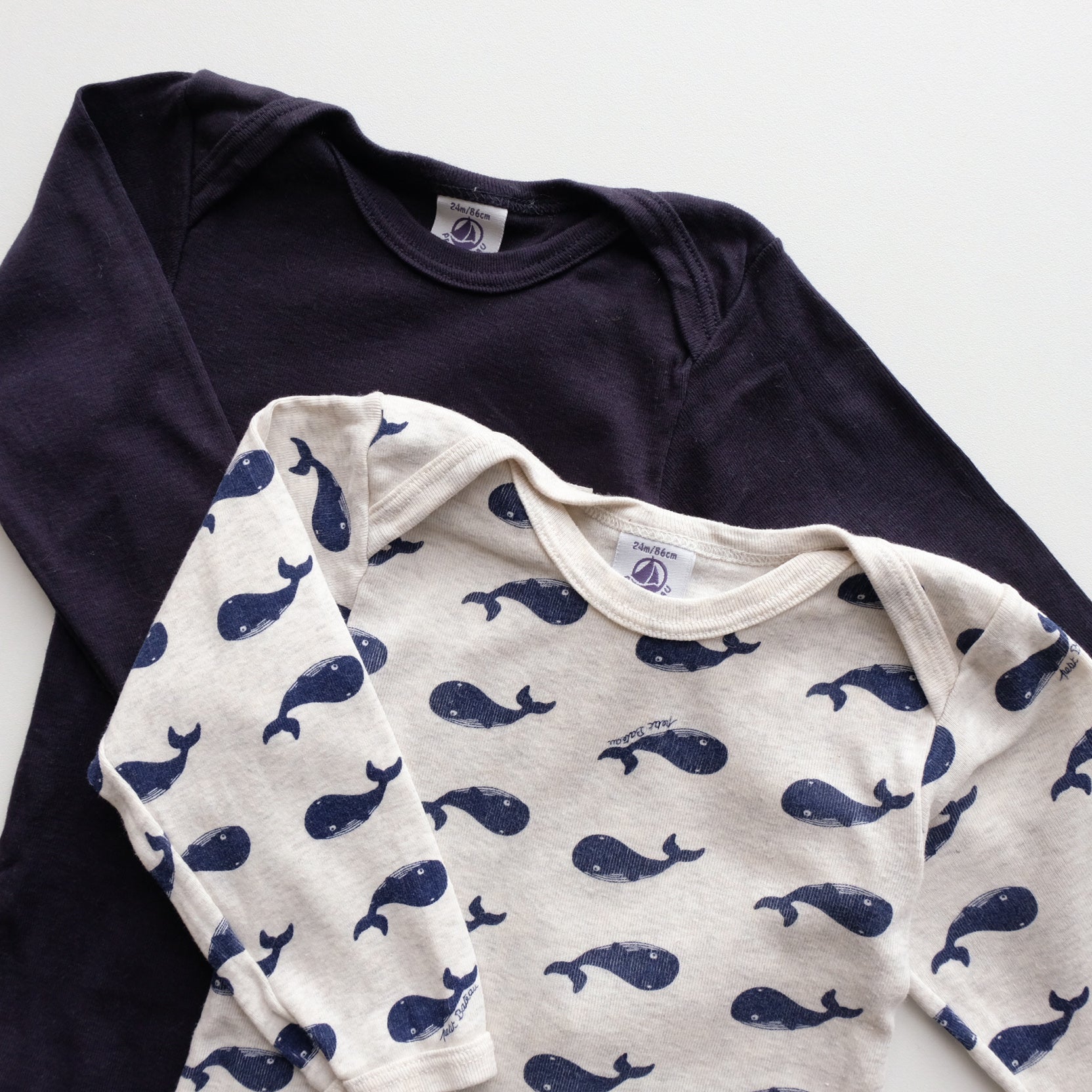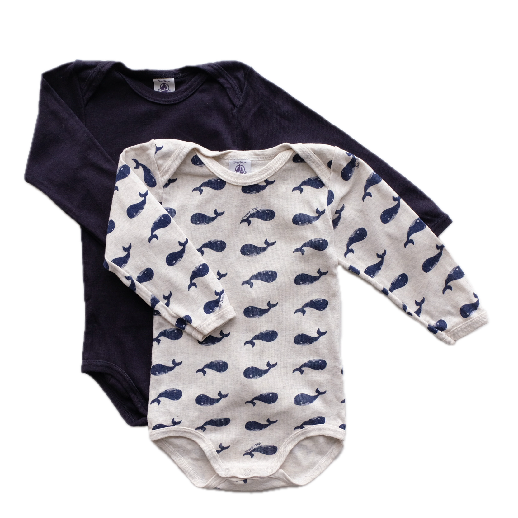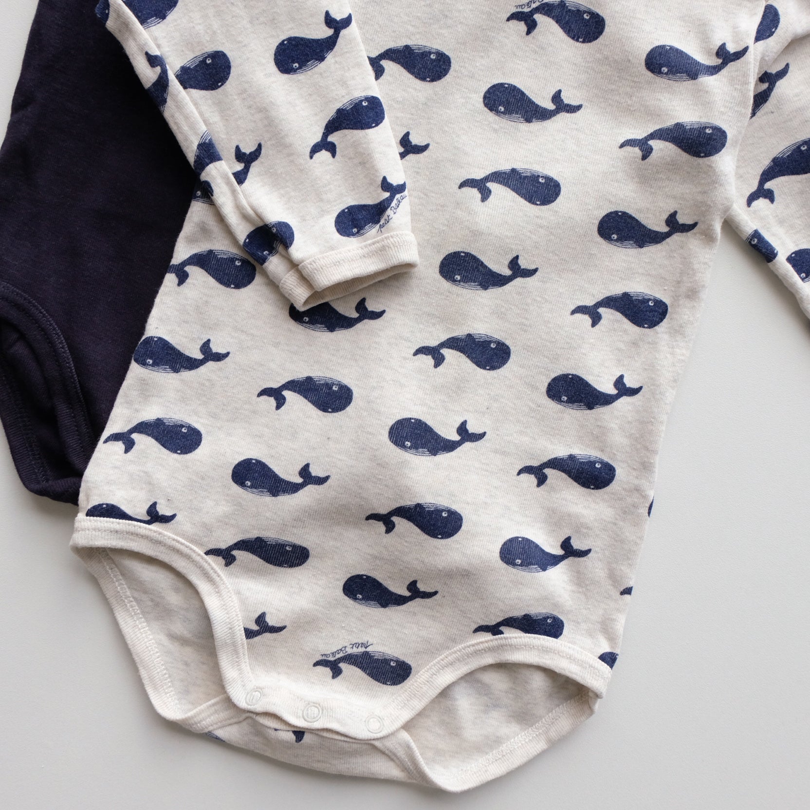 Lot de 2 bodies à manches longues, en coton biologique, coloris bleu marine uni et coloris vanille avec imprimé baleines bleues all over. Encolure américaine. Mixte.