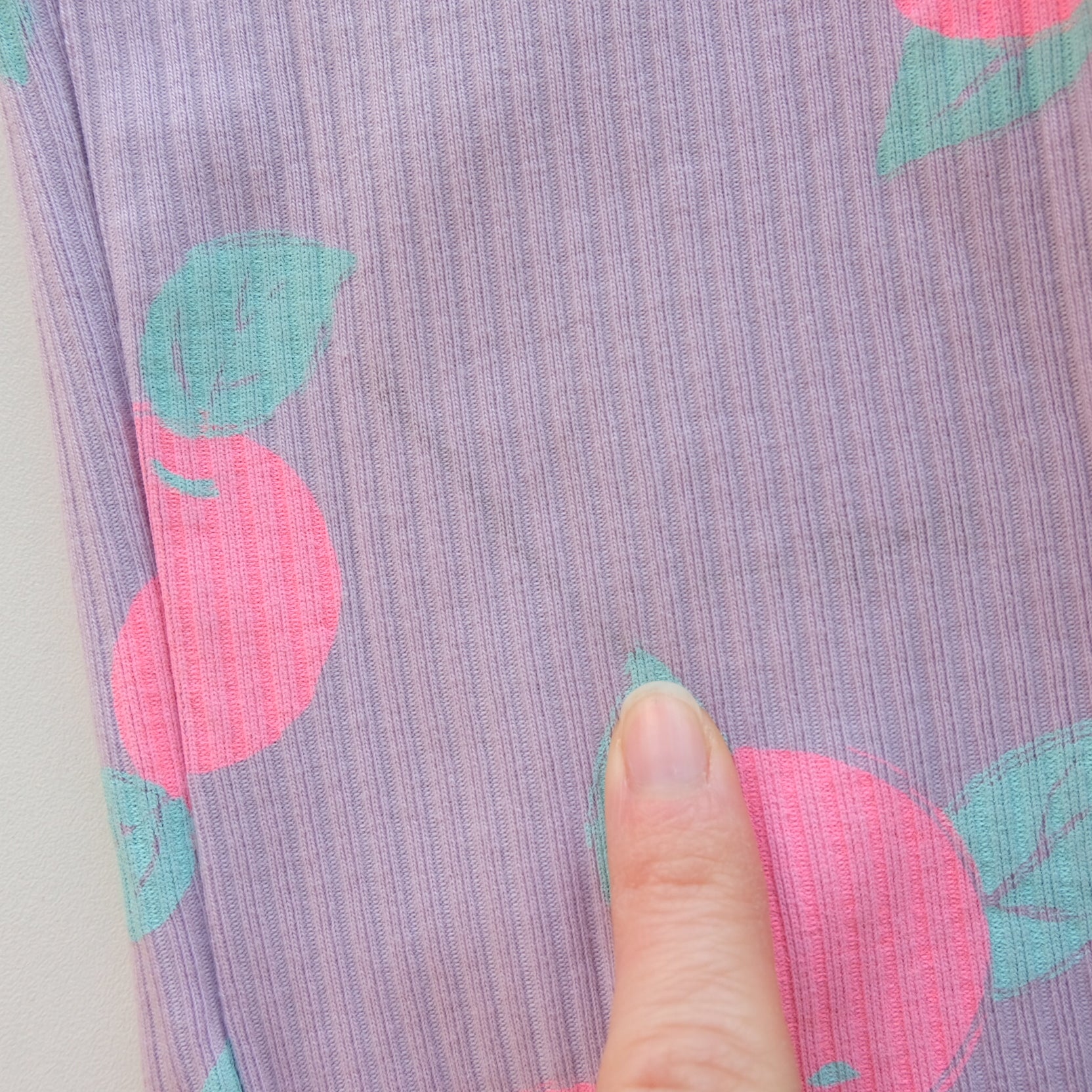 Lot de 2 legging coupe flare en coton côtelé : un legging coloris abricot motifs coloris lilas et vert d'eau all over. Et un legging coloris lilas, imprimé petites baies rose flashy all over (à noter petite trace grise sur le devant, voir photo. Sinon excellent état).