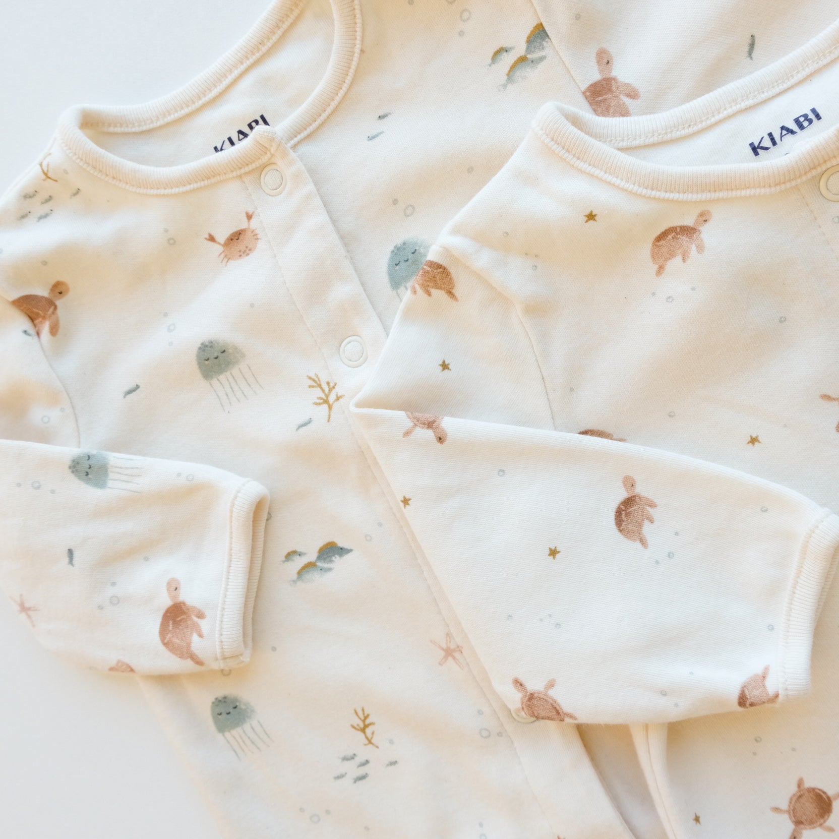 Lot de 2 pyjamas, dors-bien en coton épais, coloris vanille, imprimé sur le thème de la mer all over. Super mignons. Mixte.