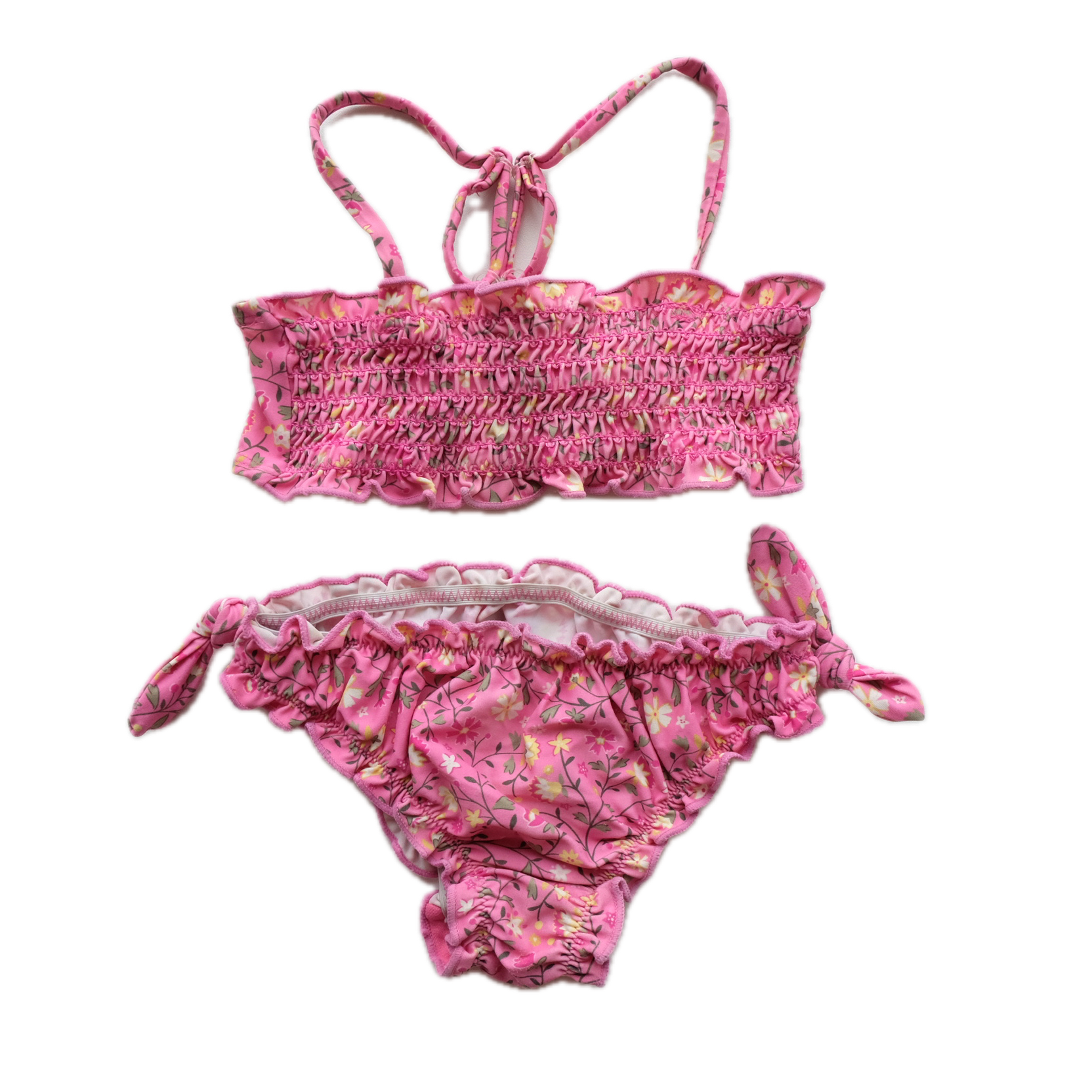 Maillot de bain 2 pièces, comprenant un bandeau avec bretelles réglables et une culotte finitions froufrous, noeuds fantaisie à nouer sur les côtés.