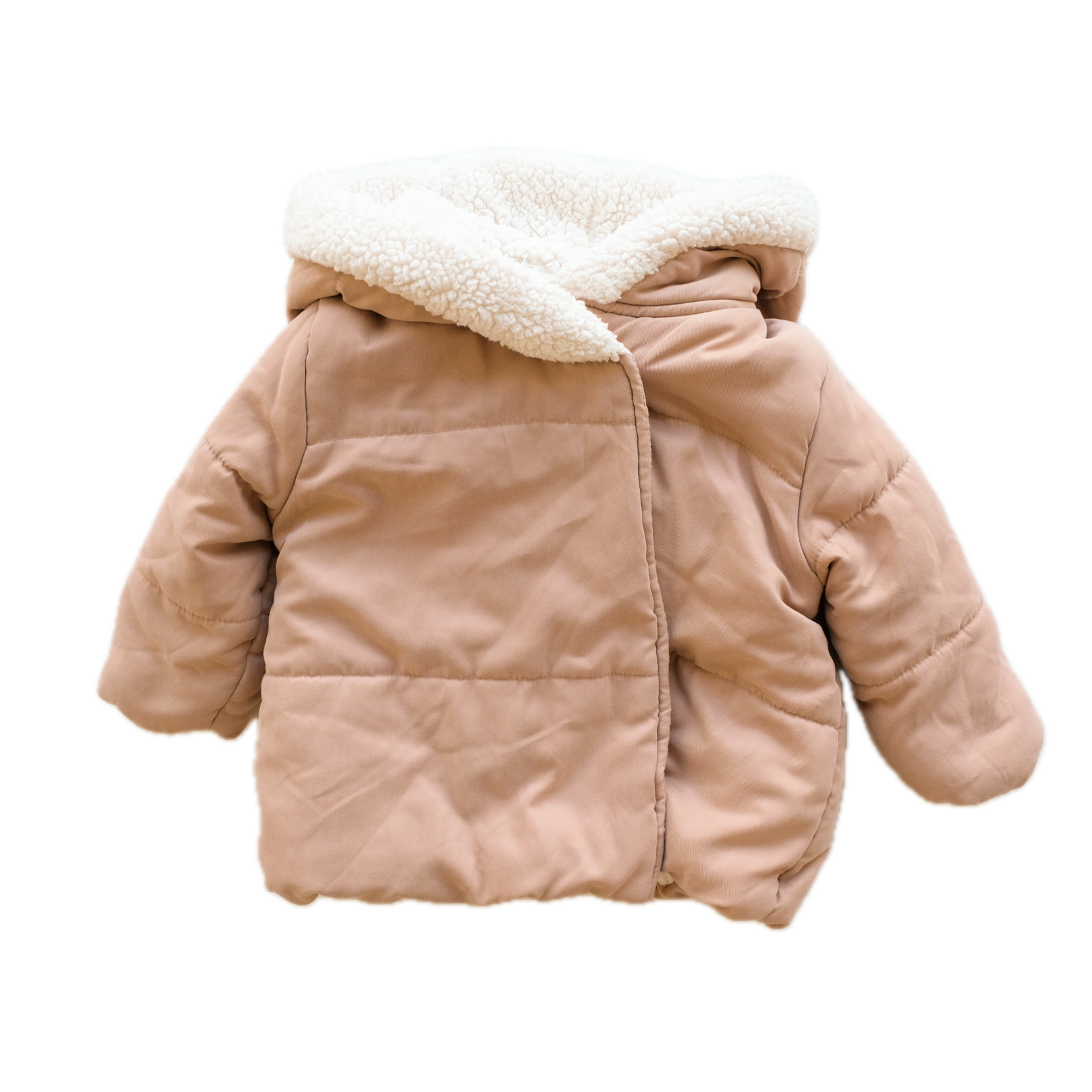 Manteau, parka coloris beige rosé, capuche intégrée. Ouverture cache coeur + boutons pressions. Doublure intérieure en moumoute. Très joli !