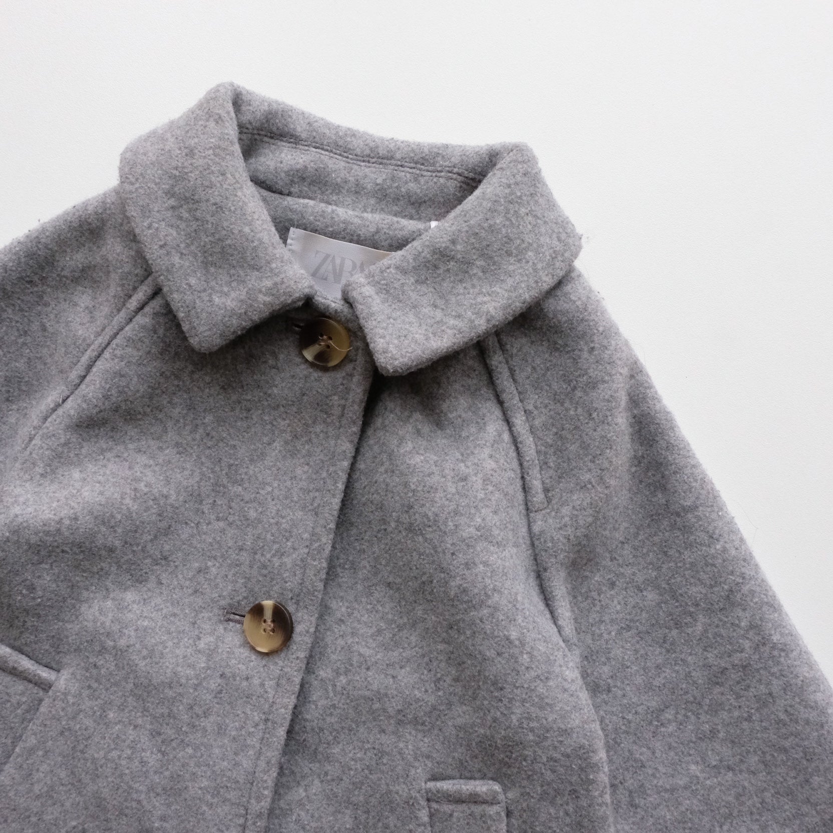 Caban, manteau coloris gris clair uni. 3 gros boutons au devant. Seul petit défaut : étiquette inétrieure légèrement jaunie.