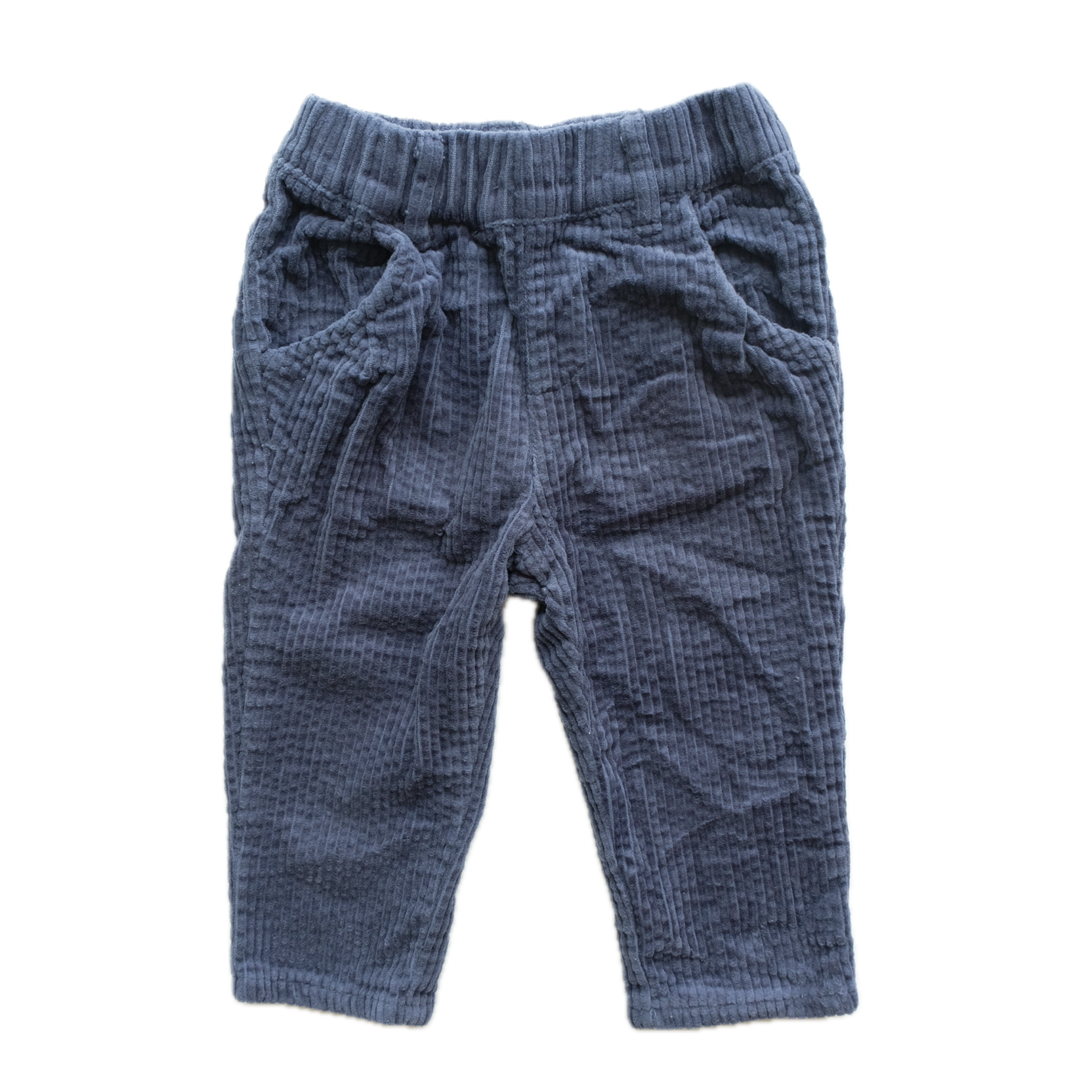 Pantalon en velours côtelé, coloris bleu foncé. Taille élastiquée ajustable.