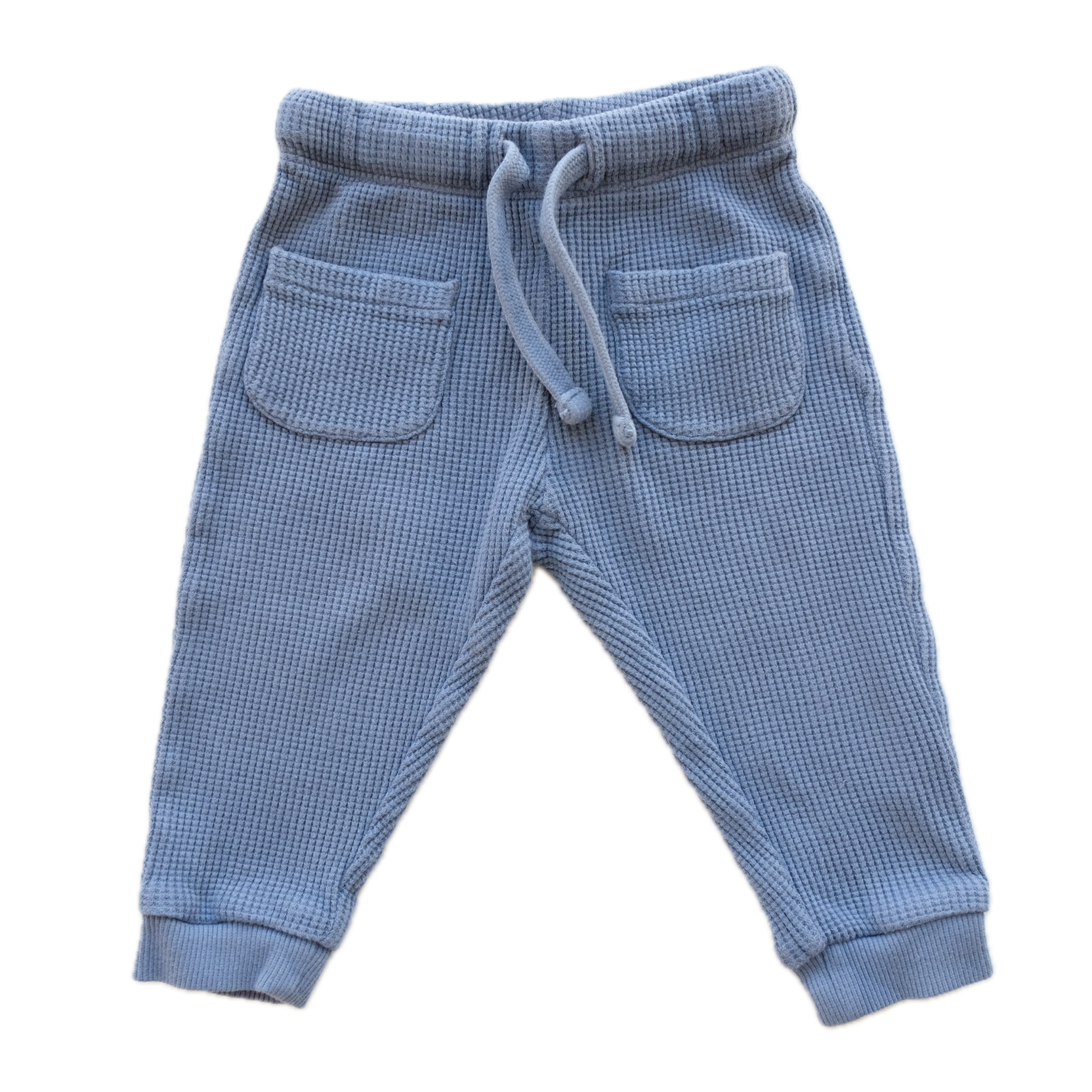 Pantalon en coton gaufré, coupe confortable, coloris bleu uni. Taille élastique + cordon de serrage.