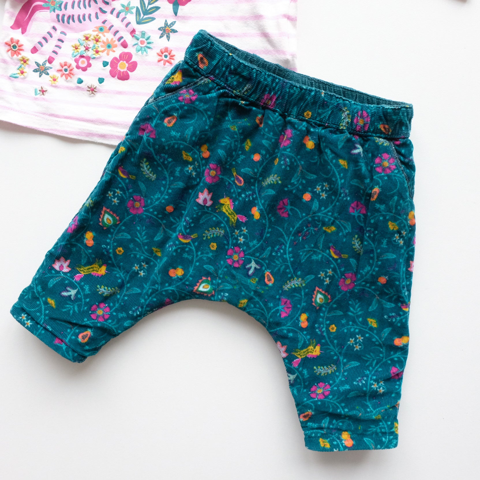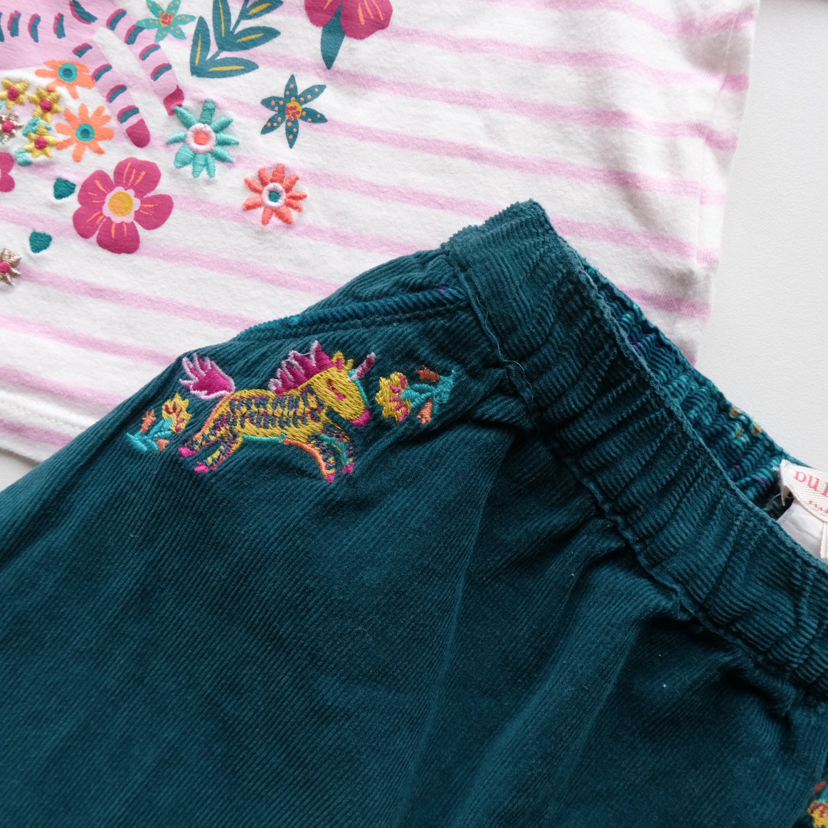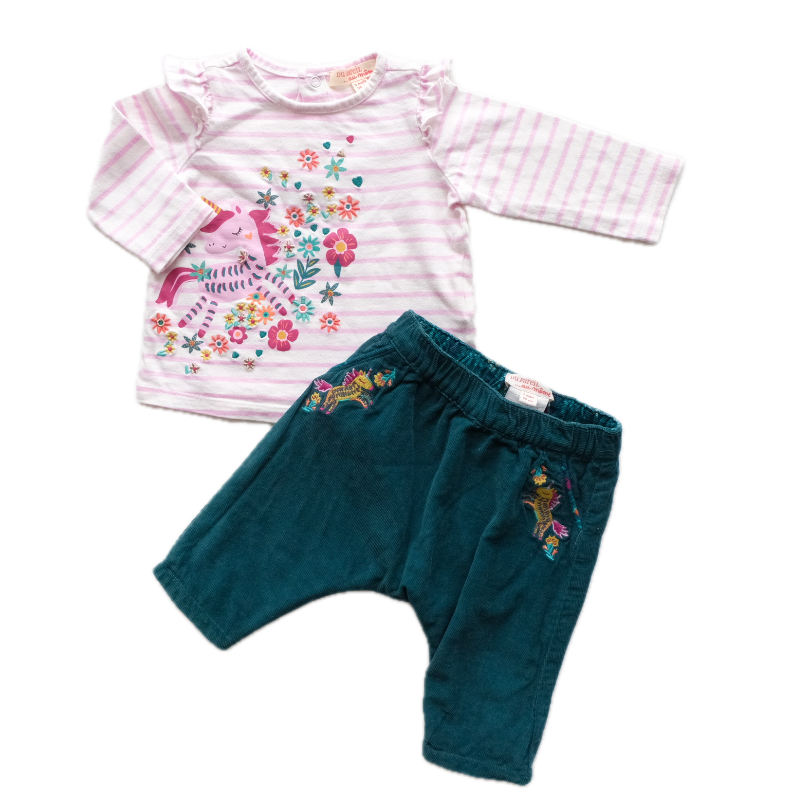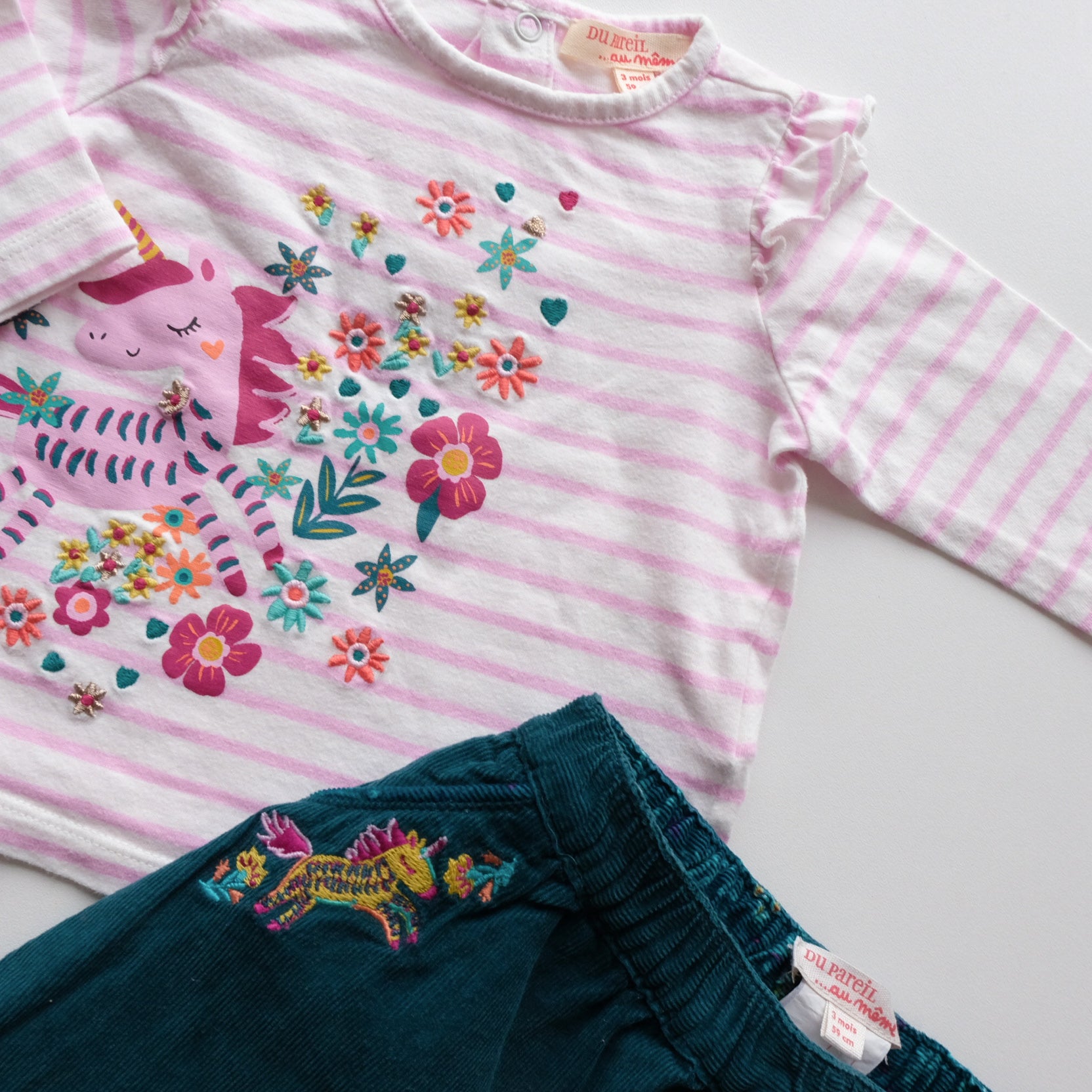 Ensemble 2 pièces comprenant Un Pantalon réversible, une face en velours côtelé, coloris bleu canard. Détails jolies broderies. Et une face bleu canard et imprimé fleuri coloré all over. Et un t-shirt à manches longues en coton. coloris blanc, imprimé rayures coloris lilas all over. Imprimé licorne au devant + jolies fleurs brodées colorées. Petits volants aux épaules. Boutons pressions en haut dos. Super mignon !