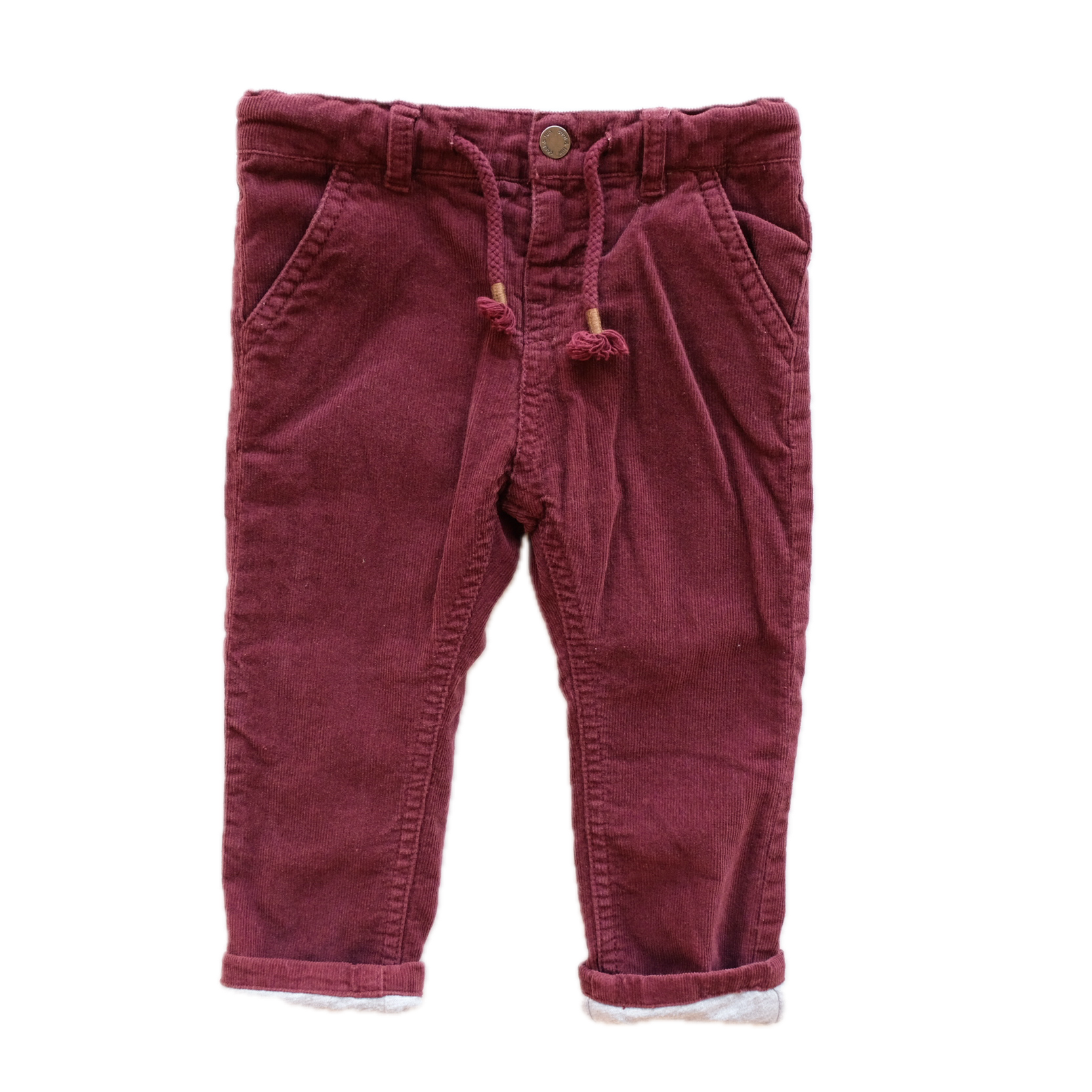 Pantalon en velours côtelé, coloris bordeaux / prune uni. Doublure intérieure en coton. Taille élastiquée ajustable + cordon de serrage.