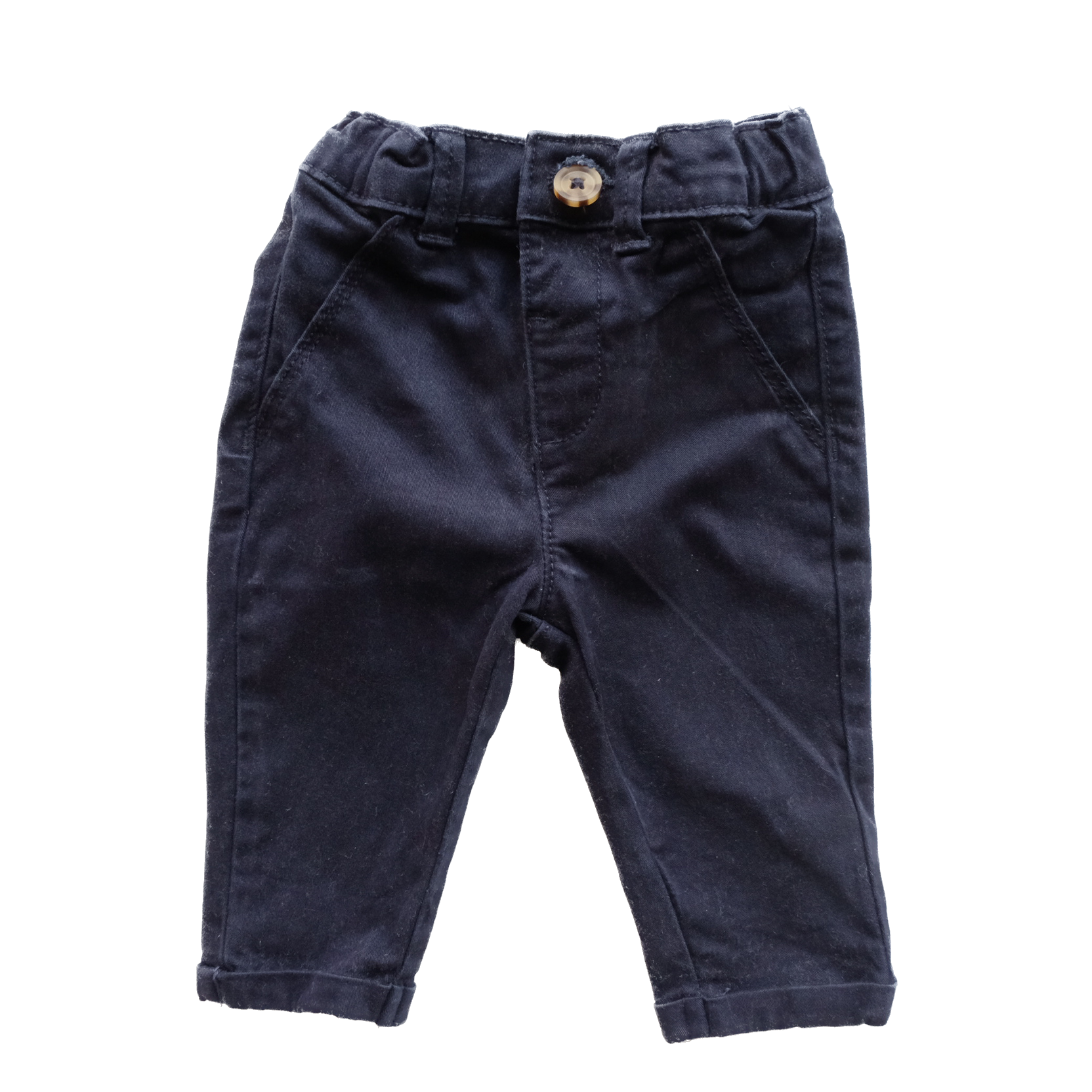 Pantalon en toile coloris bleu marine uni. Taille élastique ajustable. Petit revers sur la longueur.