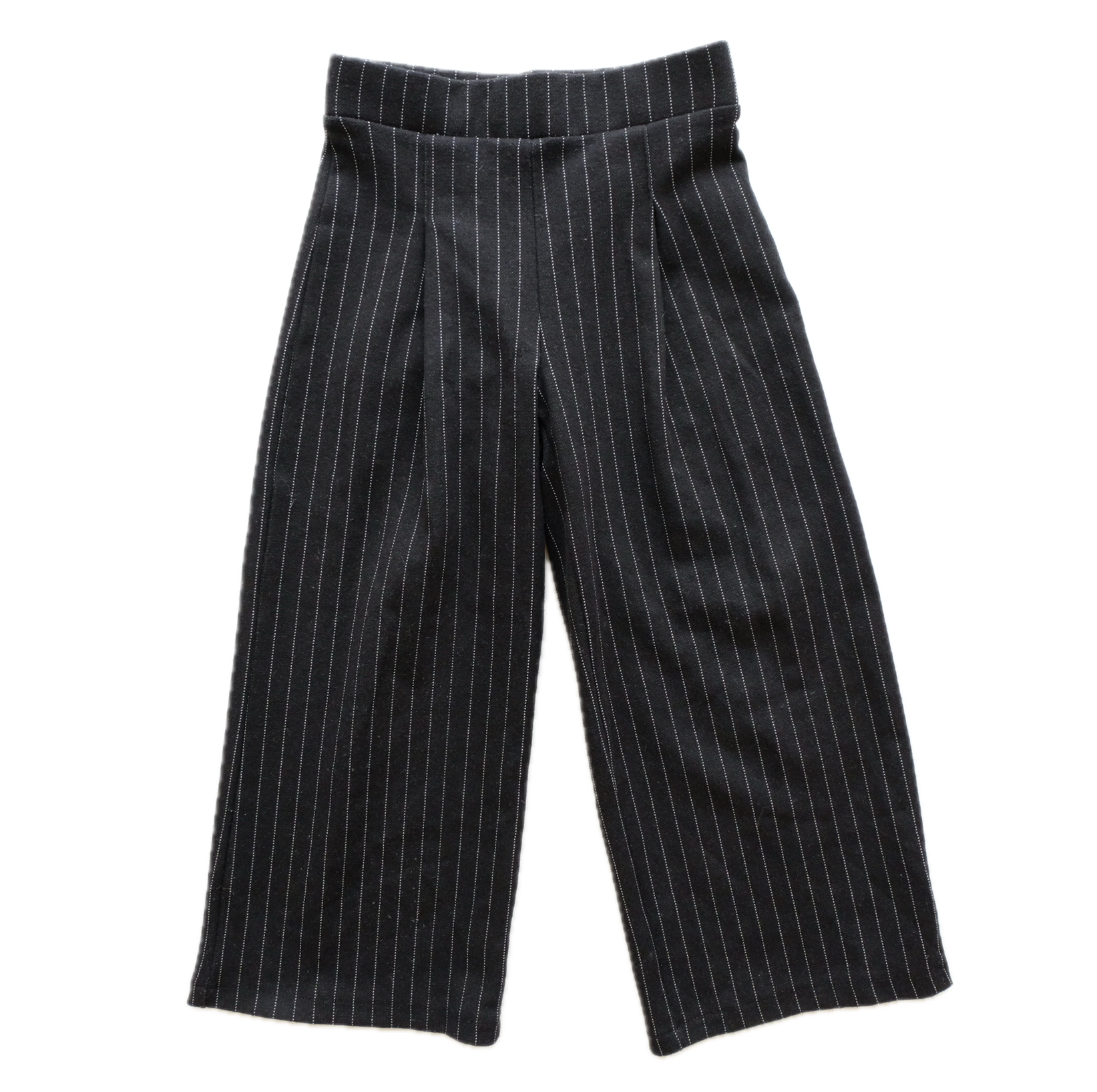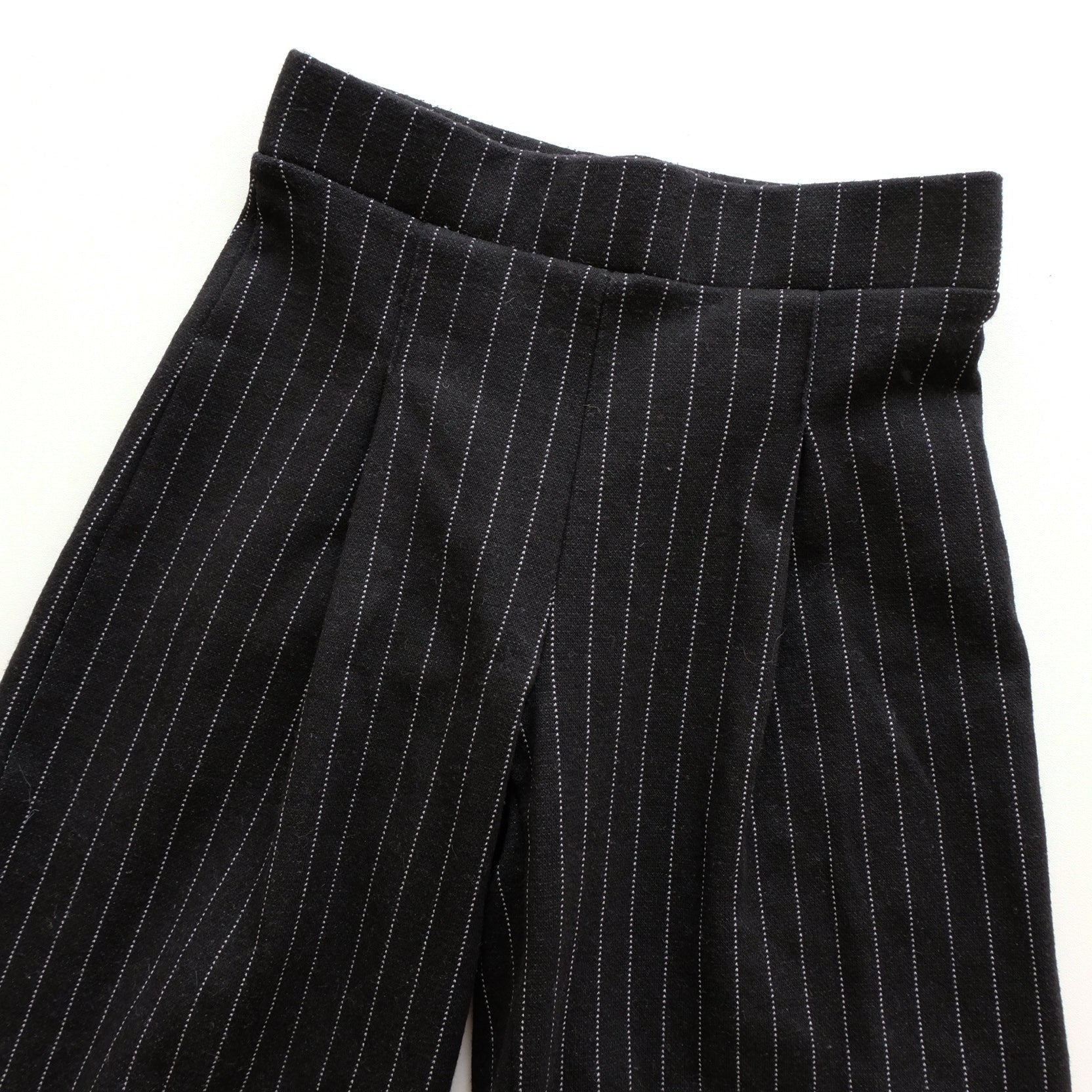 Pantalon coupe large, coloris noir, fines rayures blanches dans la longueur. Plis creux au devant. Très sympa !