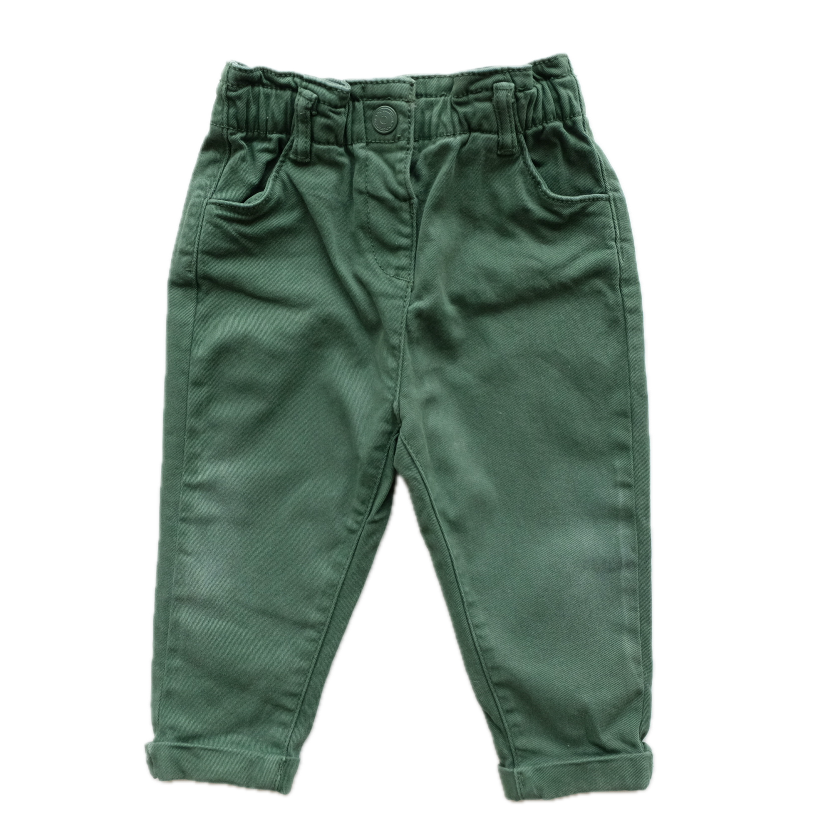 Pantalon, jean souple, coloris vert foncé, taille élastiquée ajustable. Petits revers sur la longueur. Très mignon !
