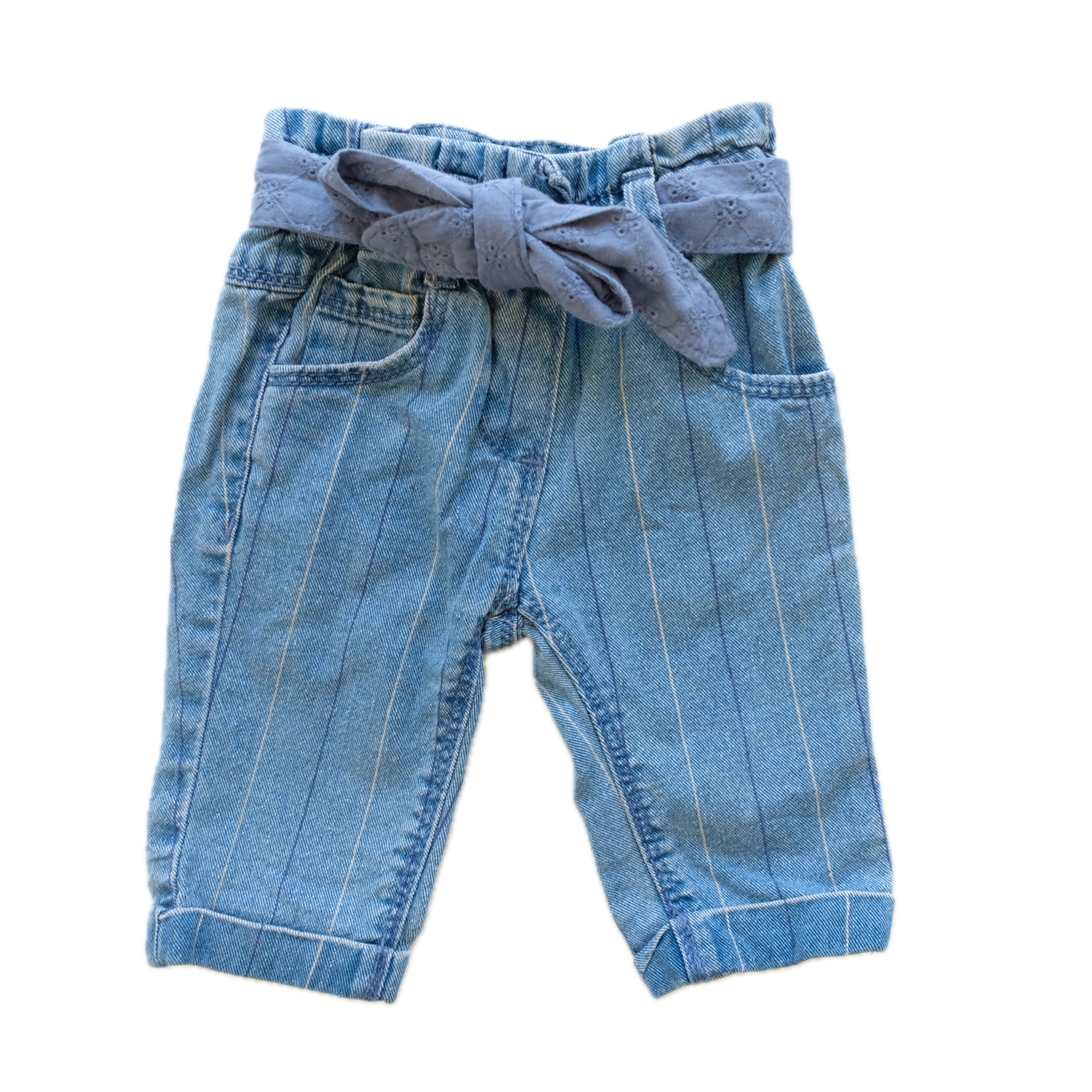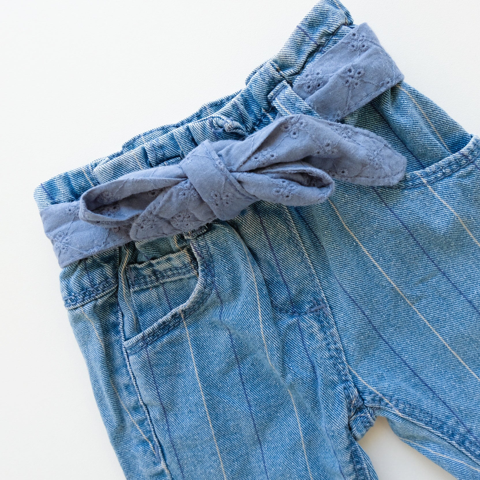 Pantalon, jean souple, coloris bleu clair, ceinture bleue en broderies anglaises à nouer autour de la taille. Taille ajustable. Adorable !