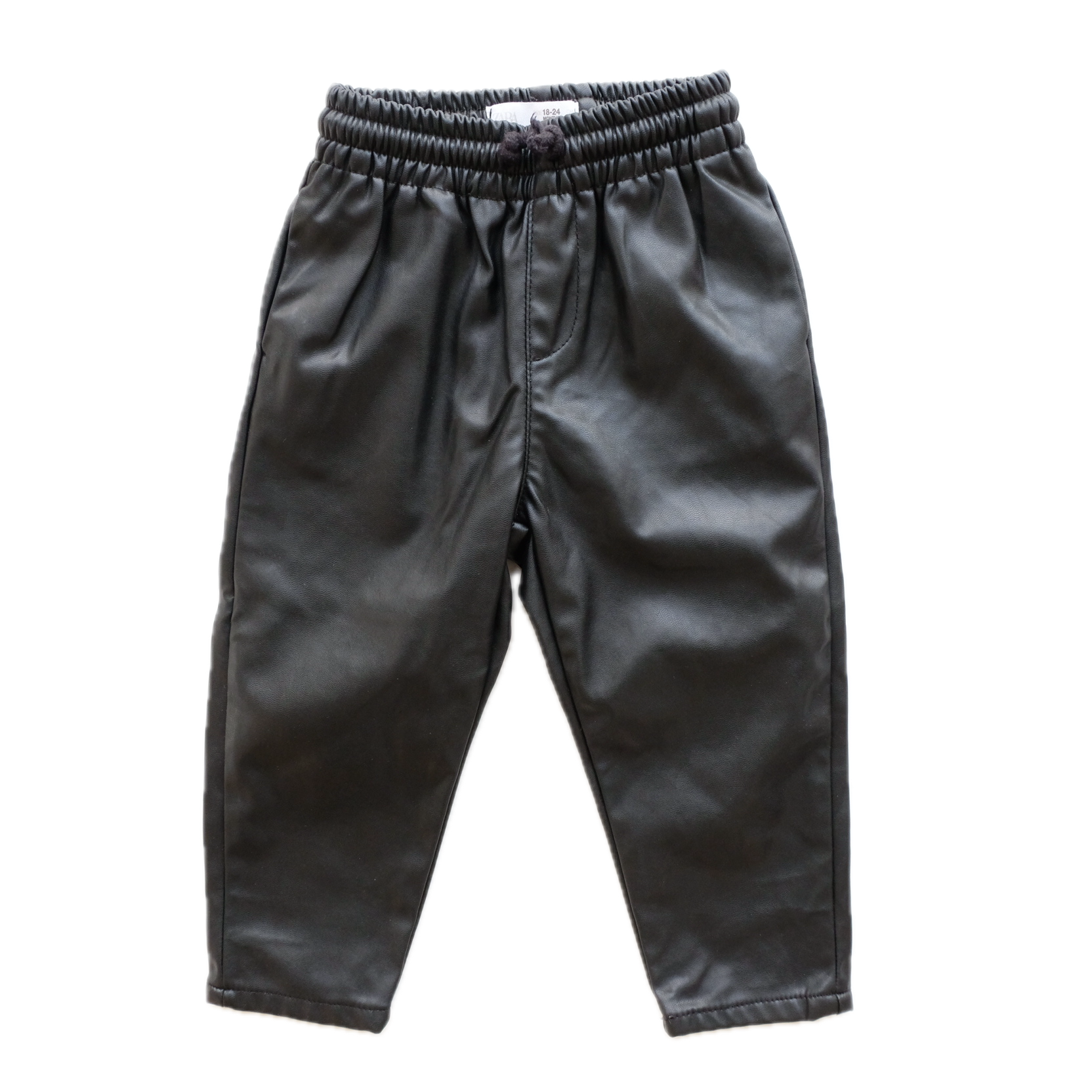 Pantalon en simili cuir coloris noir uni. Taille élastiquée avec cordon de serrage.