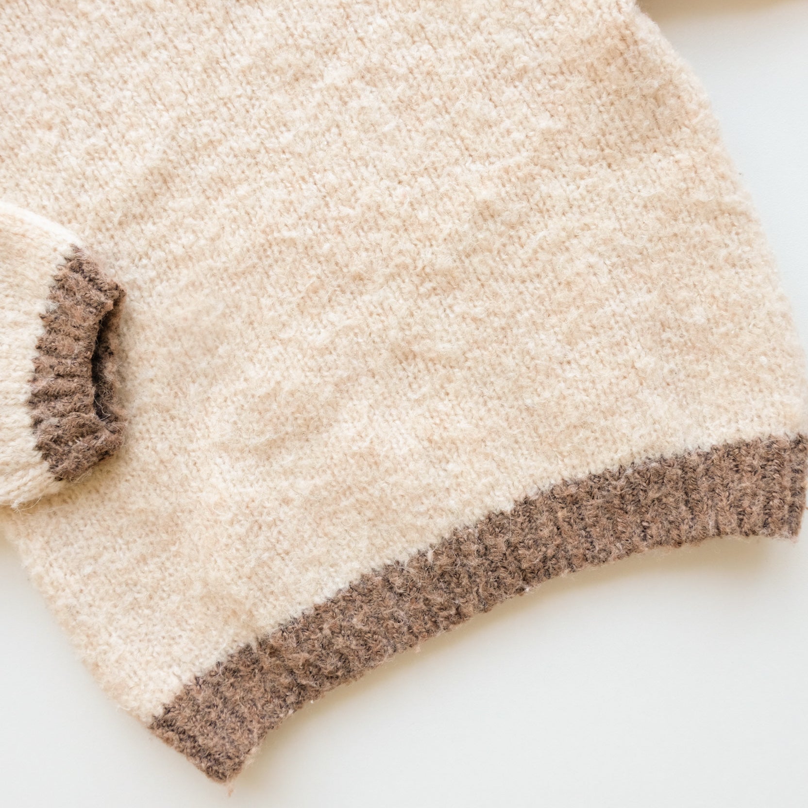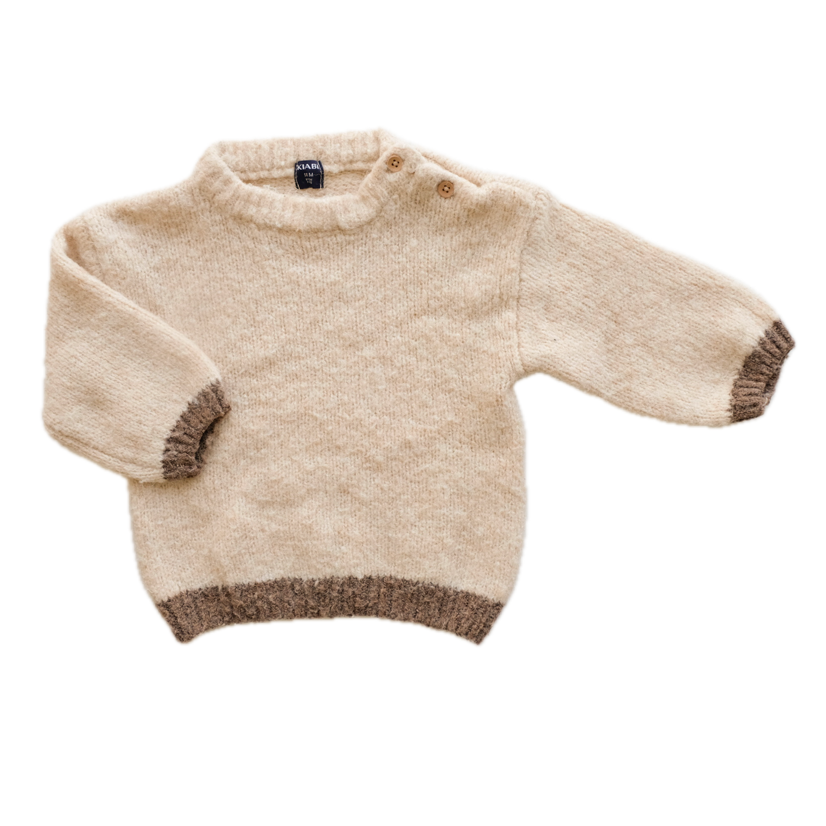 Pull à manches longues, grosse maille, coloris beige/marron. Boutonnière à l'épaule. Légèrement bouloché.