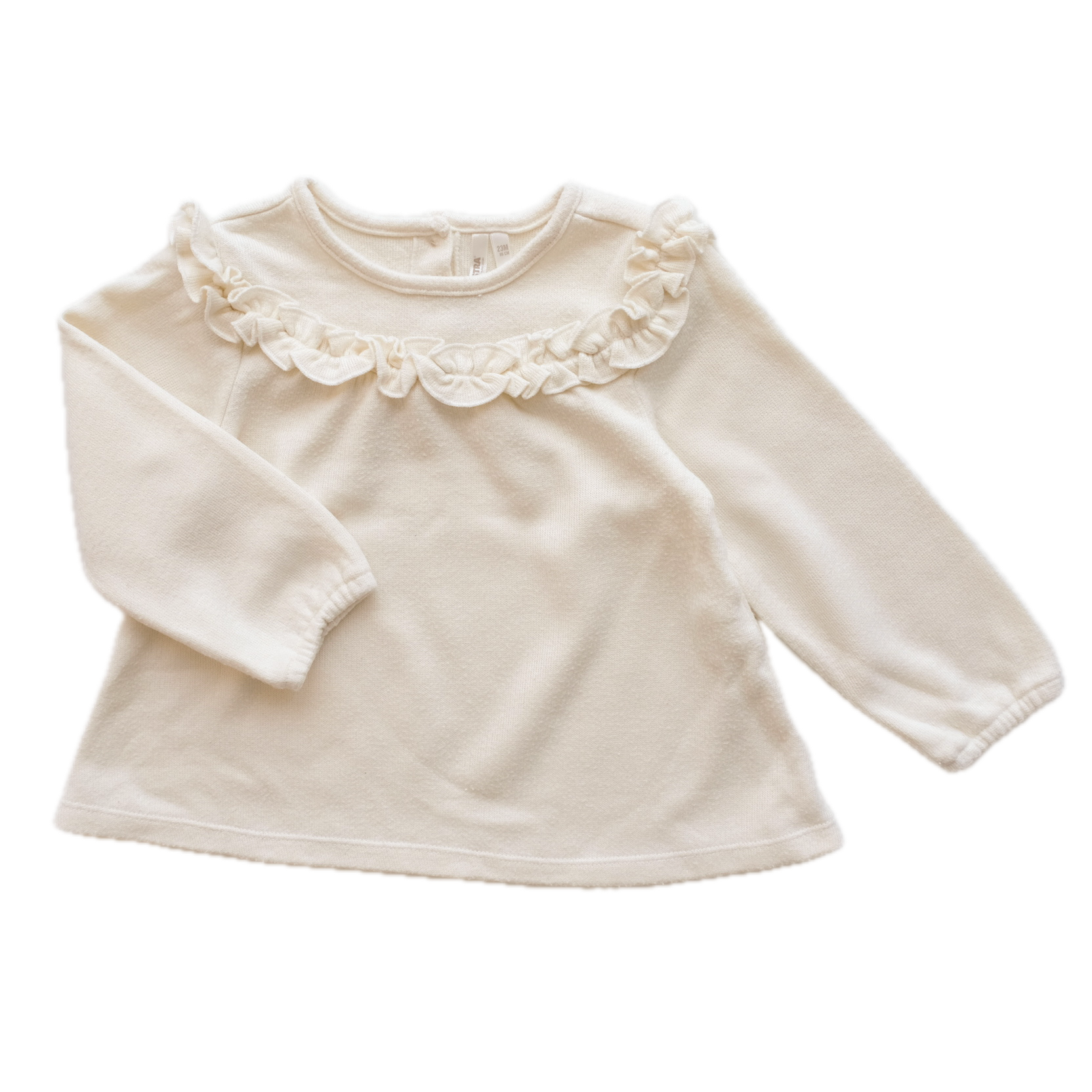 Pull fin à manches longues, coloris écru uni. Détail volants au devant et au dos. Boutonnière en haut du dos. Légères petites bouloches.