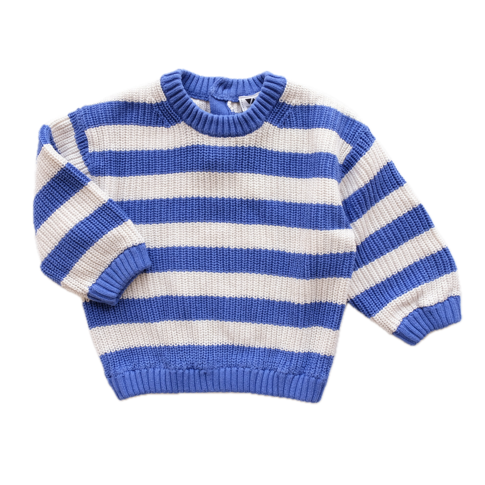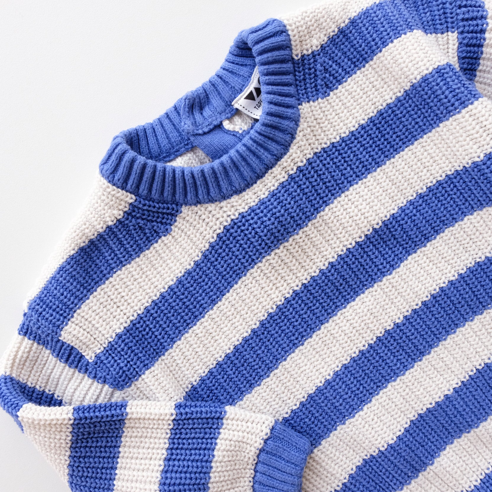 Pull à manches longues, grosse maille, coloris blanc et bleu, rayures all over. Boutonnière en haut du dos. Très beau !