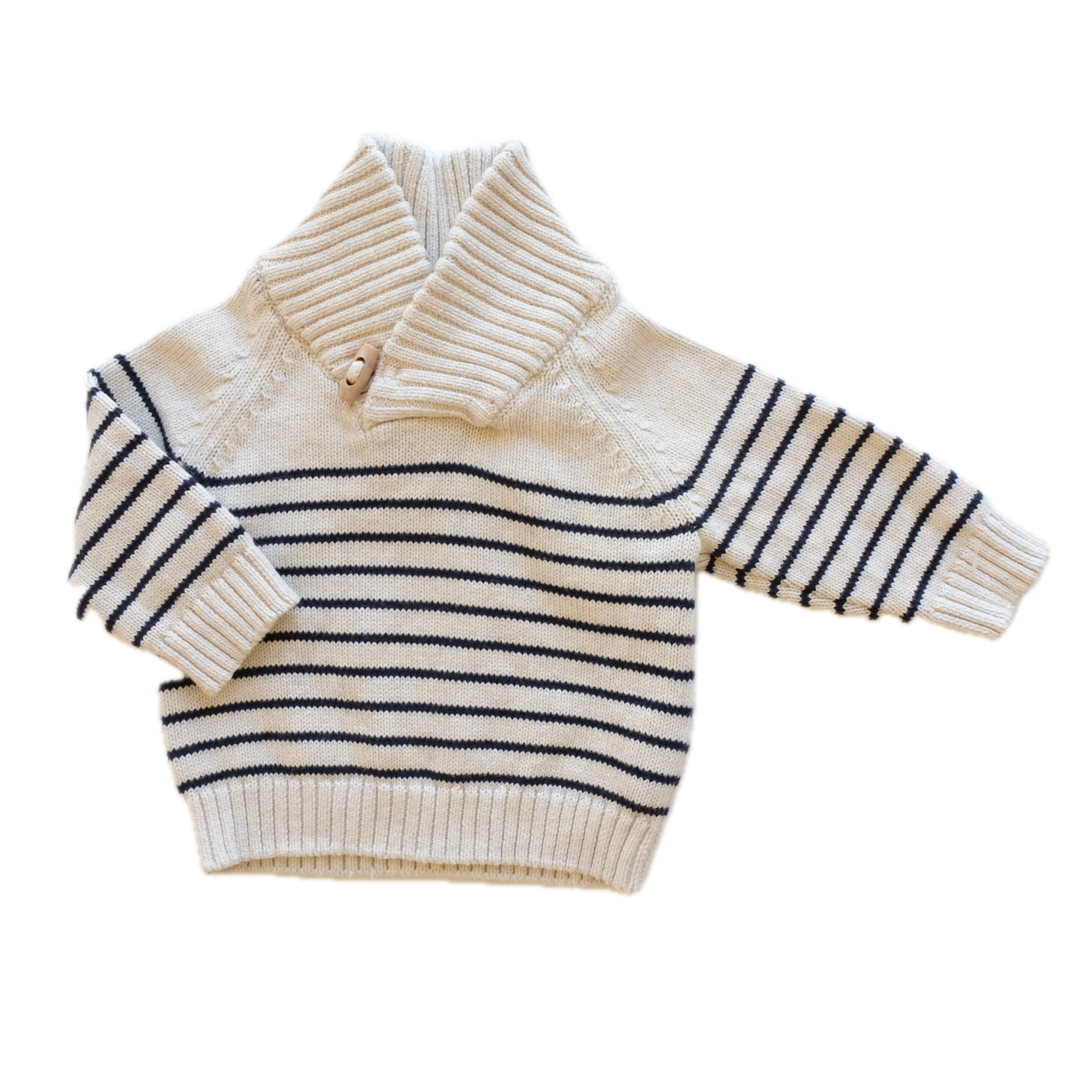 Pull à manches longues en maille, coloris écru, rayures bleu marine all over esprit marinière. Bouton brandebourg esprit duffle coat.