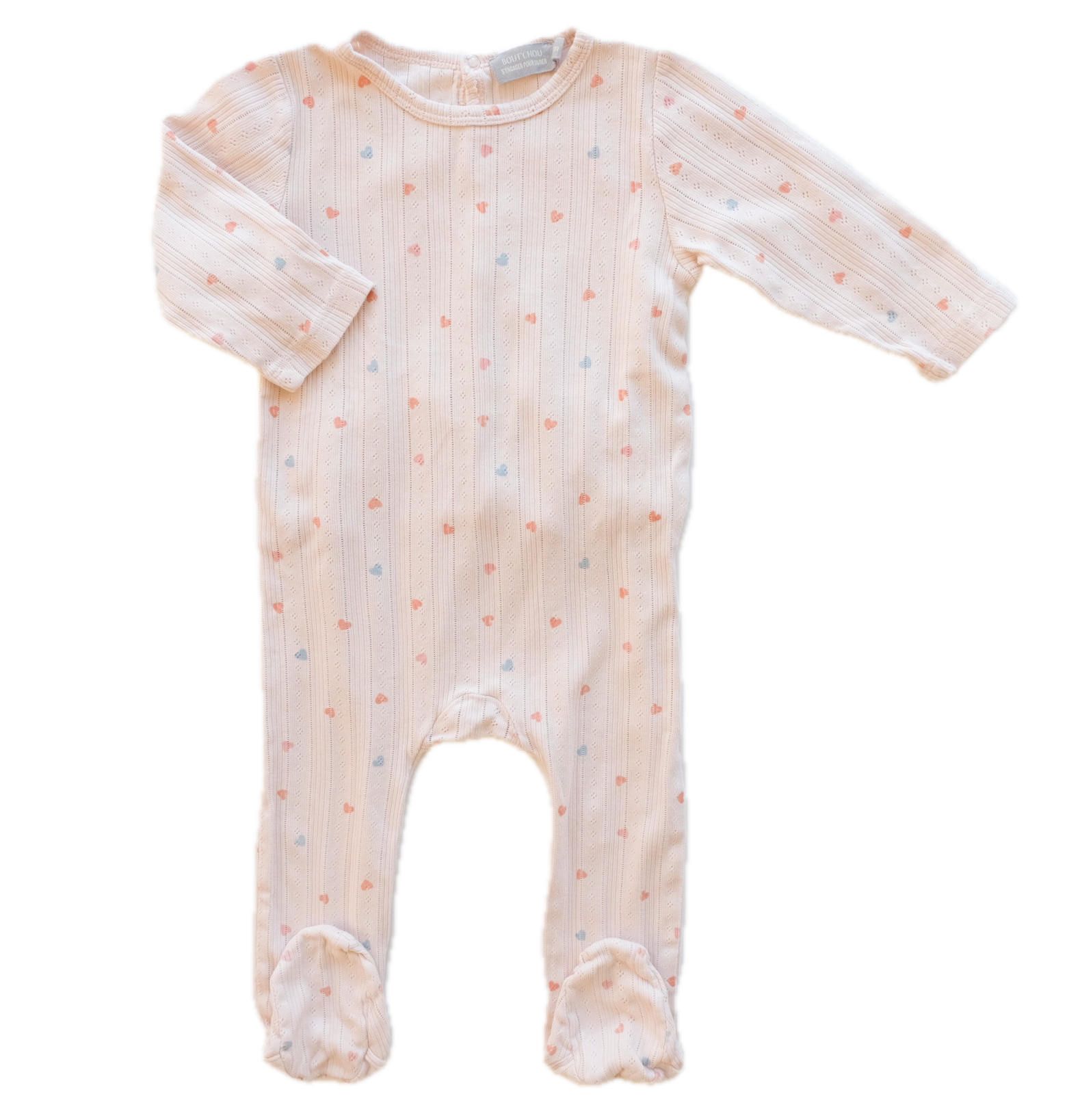 Pyjama, dors-bien en coton ajouré, coloris rose, imprimé coeurs colorés all over. Fermeture par pont et boutons pressions au dos.