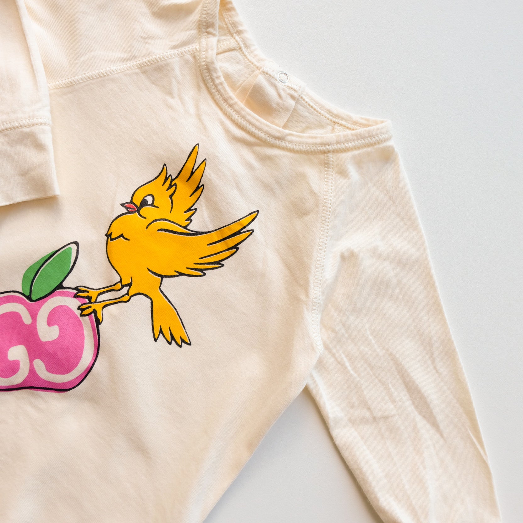Pyjama, dors-bien en coton léger, coloris vanille imprimé oiseau jaune et fruit coloré au devant. Boutons pressions au dos et à l'entrejambe. Fabriqué en Italie.