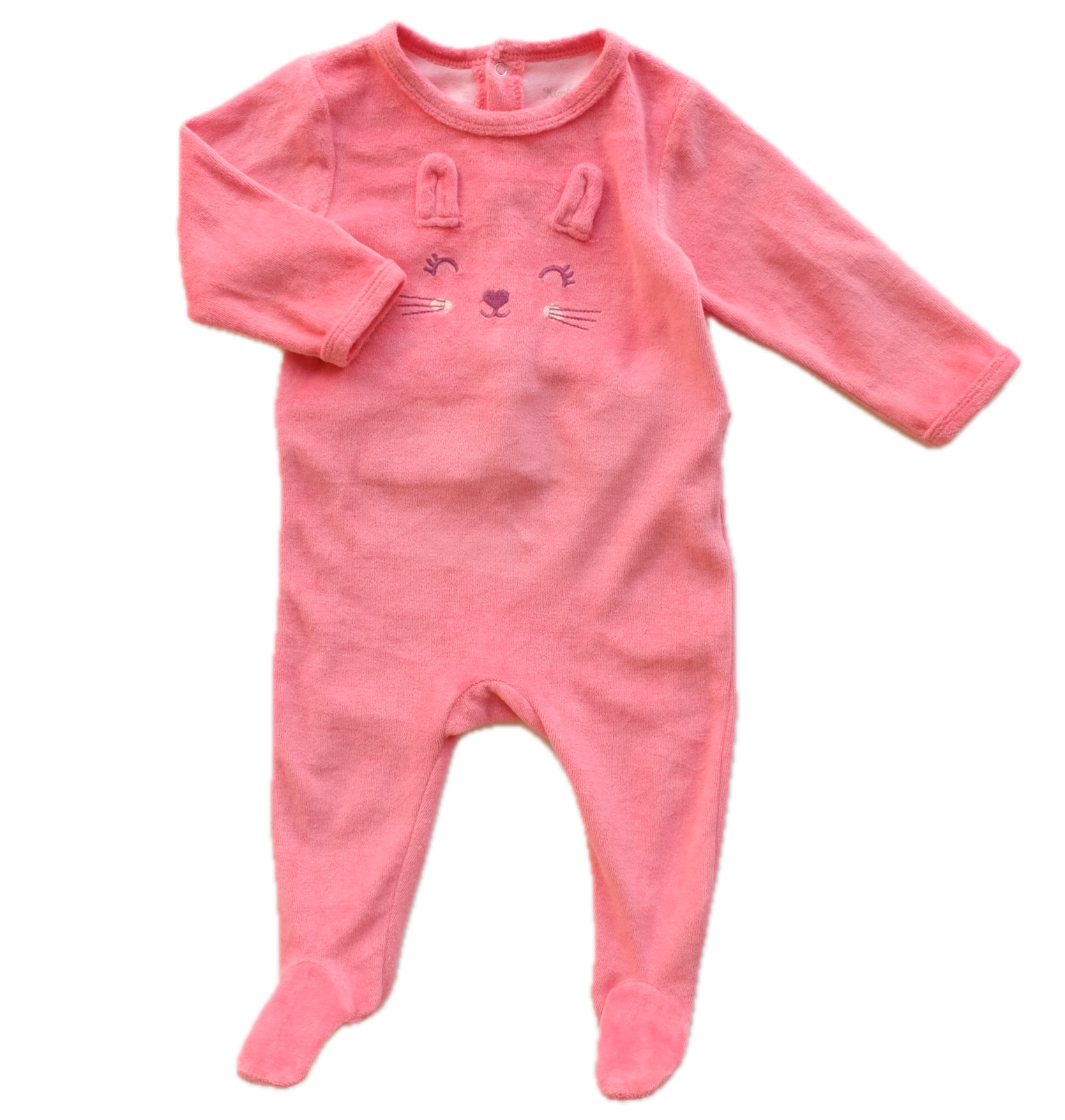 Pyjama dors-bien avec pieds en velours rose, fermeture par pont et boutons pressions au dos.