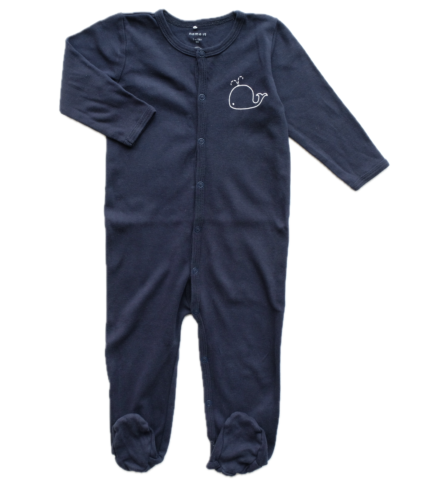 Pyjama, dors-bien en coton, coloris bleu marine, imprimé baleine au devant. Boutons pressions au devant.